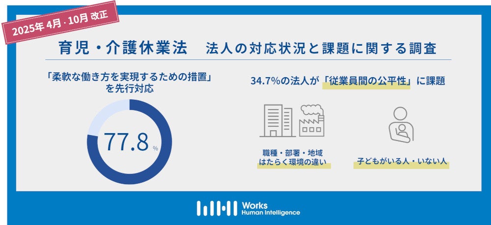 株式会社Works Human Intelligenceは、統合人事システム「COMPANY」のユーザーである大手法人を対象に、2025年4月、10月に段階的に施行される育児・介護休業法改正に関する調査を実施し、72法人から回答や生の声が得られたので結果をお知らせします(調査期間:2025年1月27日~2月28日)。