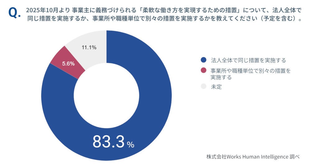 本措置は、必ずしも企業全体で同じ措置を実施する必要はなく、職種や事業所によって異なる措置の組み合わせを選択することも可能です。しかし本調査では、83.3%の企業が「企業全体で同じ措置を実施する」との回答でした。