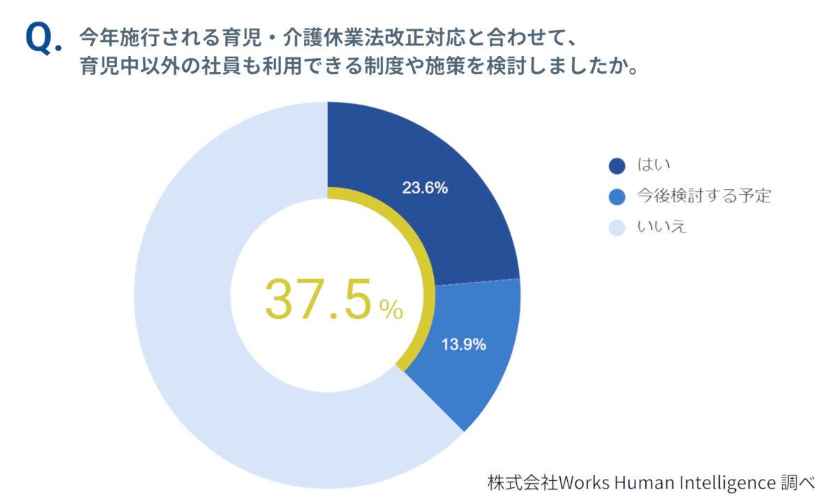 37.5%の大手法人が、「法改正を機に育児中以外の従業員も利用できる制度や施策を検討した」、または「今後検討していく」と回答