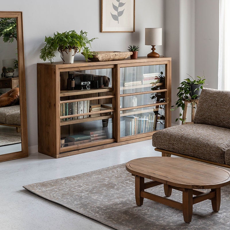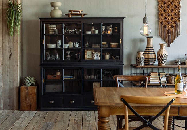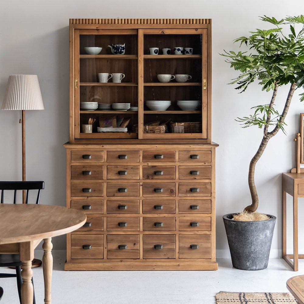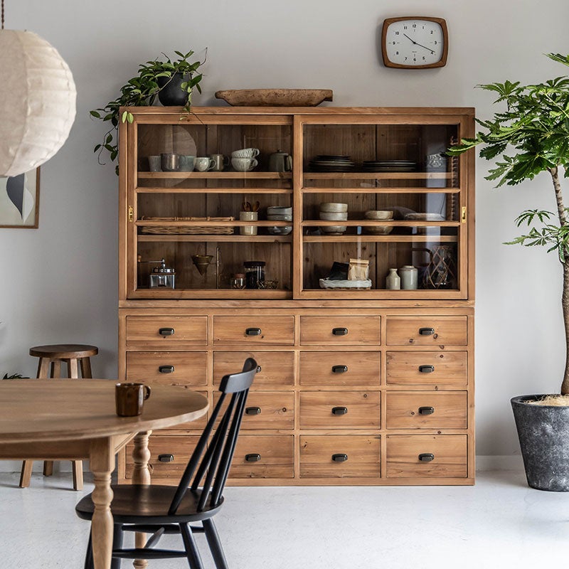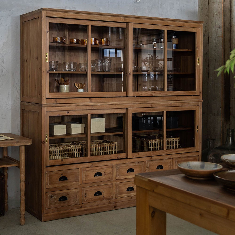 水屋箪笥をモチーフにしたキャビネット。ガラスの引戸にあしらわれた格子の意匠が目を引きます。上台部分にはお気に入りの食器や雑貨を飾り、下台引出しには細々したものを収納できて実用的です。上台と下台は別々にもご利用いただけます。