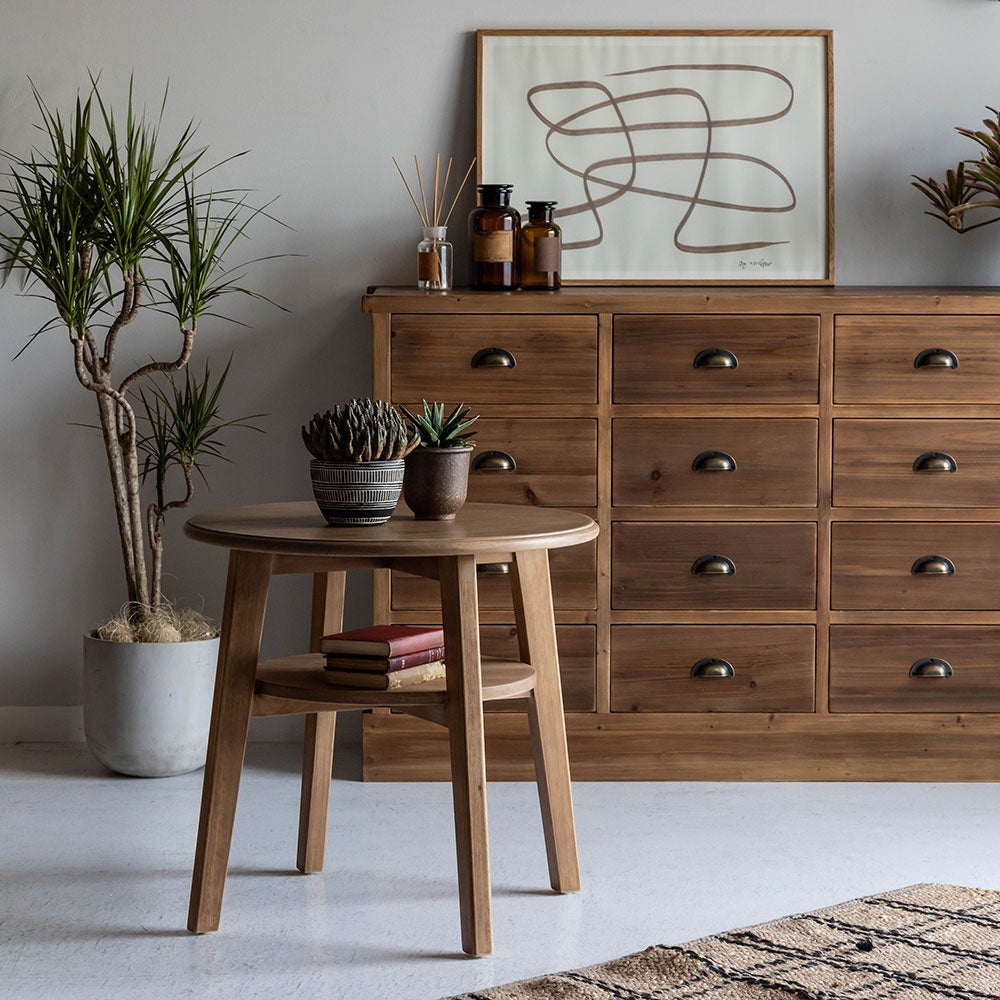使い勝手の良いサイドテーブル。天板縁に施された装飾が、シンプルなデザインの中にさりげない印象的な陰影を生み出します。小物が置ける中棚もあり実用的。ソファやベッドサイドでの使用に便利です。