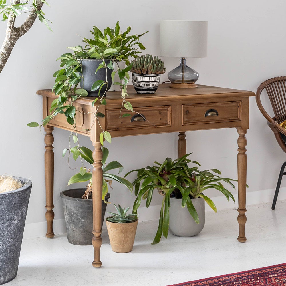 装飾的なろくろ脚が目を引くアンティーク調のデスク。側面の掘り込みや取っ手まで細部にこだわり仕上げています。引出しはA3サイズも収納可能。ミラーを設置して化粧台としてお使いただくのもおすすめです。2サイズで展開。