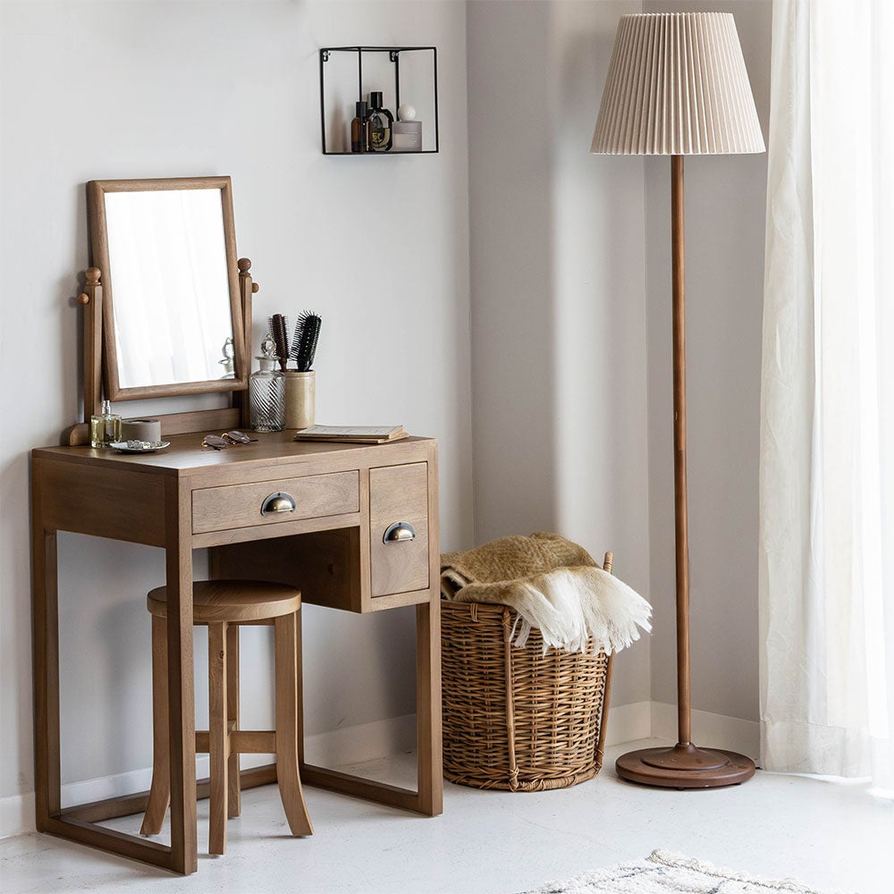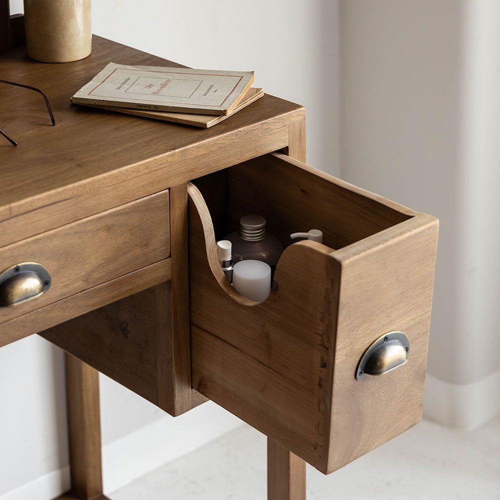 レトロな趣のある小さめサイズのドレッサー。サイドには深めの引出しがついており、化粧水やスタイリング剤など高さのある化粧品やメイク道具を収納できます。引出内側に切り欠きを施し、出し入れしやすいように仕上げています。2サイズで展開。