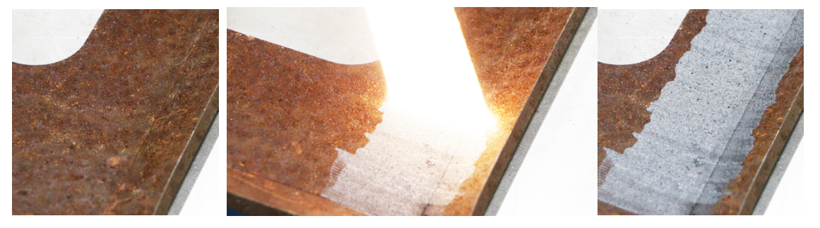 サビ落とし(左:レーザー照射前、中:レーザー照射中、右:照射後)