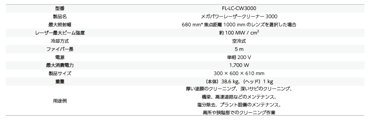 本製品は、単位面積あたりの集光強度が100メガワットになるレーザー光を集中的に照射することで、効率的に汚 れやサビ、塗膜等を除去します。クラス最高(*)の集光強度を実現したことにより、他社製1,500 W以上のレーザ ークリーナーでも除去することのできなかった深いサビや厚みのある塗膜、頑固な汚れまで除去可能です。