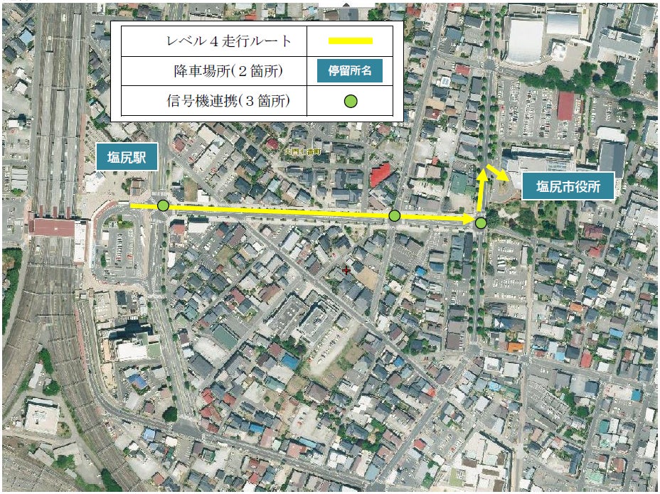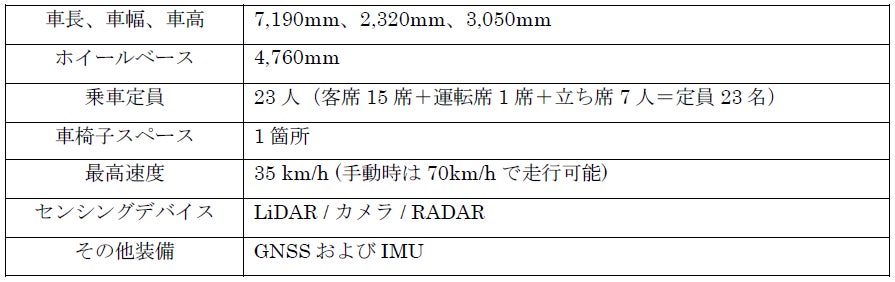 本実証実験では、2023年度に一般財団法人塩尻市振興公社が購入した株式会社ティアフォー製Minibusを使用し、塩尻駅・塩尻市役所間において、一般公道混在空間の自動運転レベル4(特定自動運行)にて運行します。