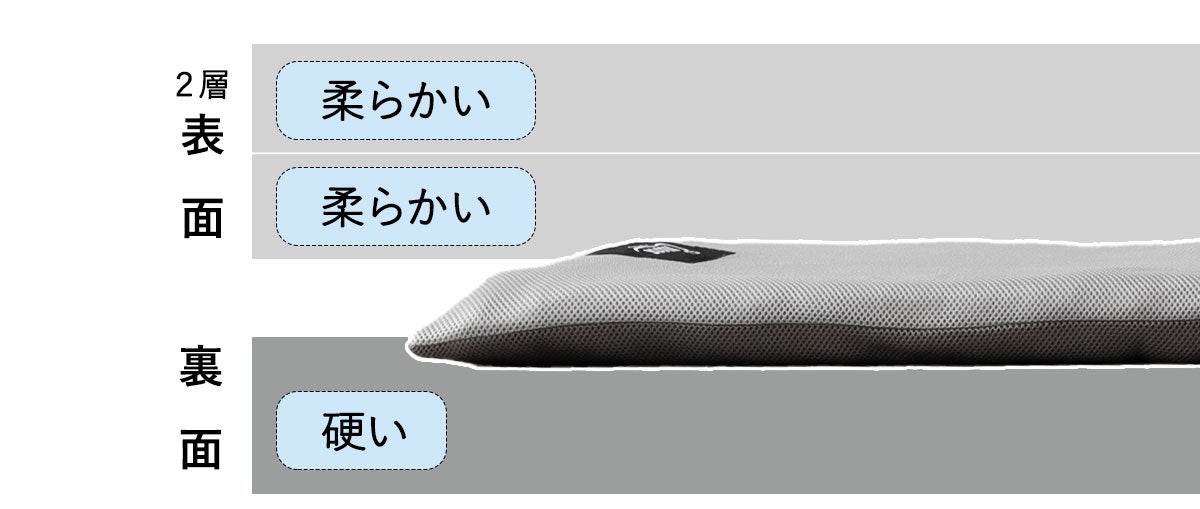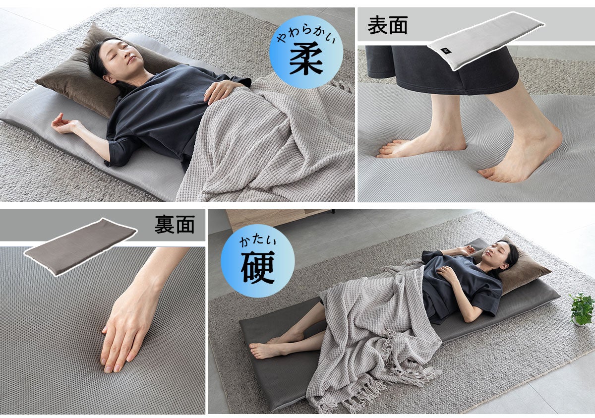 表裏で硬さが異なるリバーシブル設計。厚みの違いではなく、特殊素材ダブルラッセルの密度を変えることで、硬めと柔らかめの寝心地を実現しました。通気性が良くへたりにくい素材なので、長く快適にお使いいただけます。