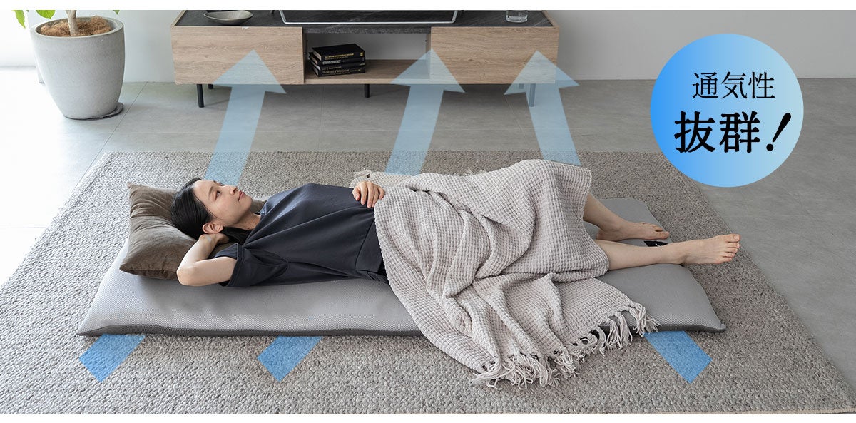 中材に構造ダブルラッセル構造『ファインエアーⓇ』を使用。熱を溜め込まない構造なので、真夏でもサラッと快適。暑い季節に感じやすい「暑さ」「蒸れ」の悩みを解消し、汗ばむ季節でも心地よくお使いいただけます。