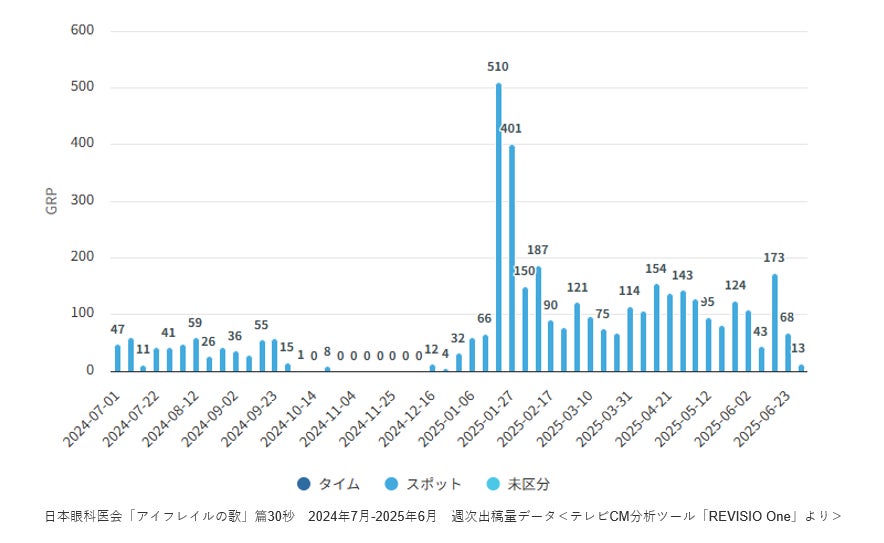 なお、「アイフレイルの歌」篇30秒のCM出稿量を週次データで確認すると、1月20日・27日週の出稿量が突出していることがわかります。この期間は、フジテレビのAC差替えが活発になった時期であり、2024年下半期と比較すると2025年上半期の出稿量が圧倒的に増えていることがグラフから読み取れます。