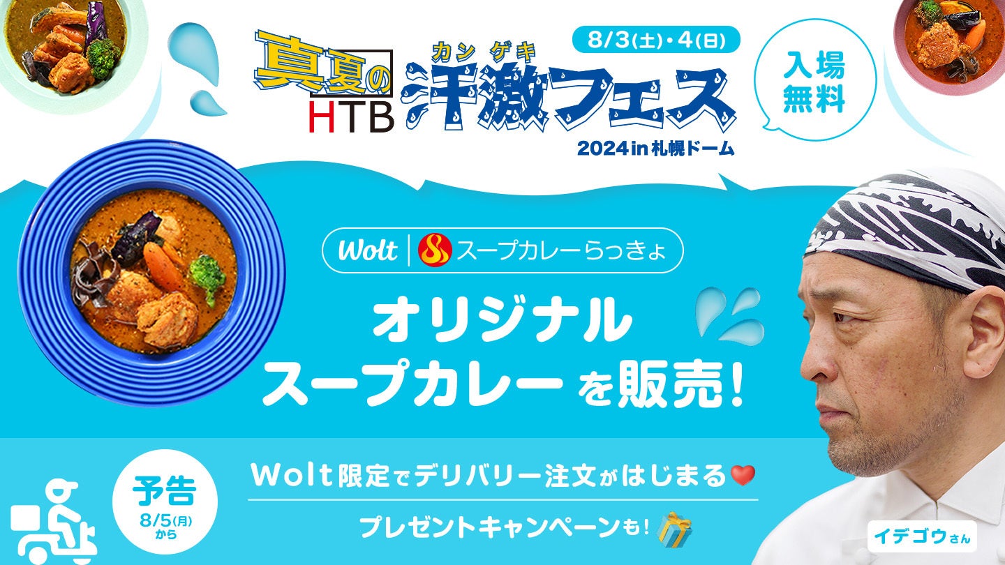 デリバリーサービス「Wolt(ウォルト)」を展開するWolt Japan株式会社(本社:東京都渋谷区、代表:Natalia Khizanishvili、以下 Wolt)は、札幌ドームで8月3日(土)~8月4日(日)に開催される『真夏の汗激(かんげき)!!フェス 2024 in 札幌ドーム』(主催:HTB北海道テレビ)に参加します。イベントでは、「スープカレーらっきょ」とコラボメニューを開発、販売します。