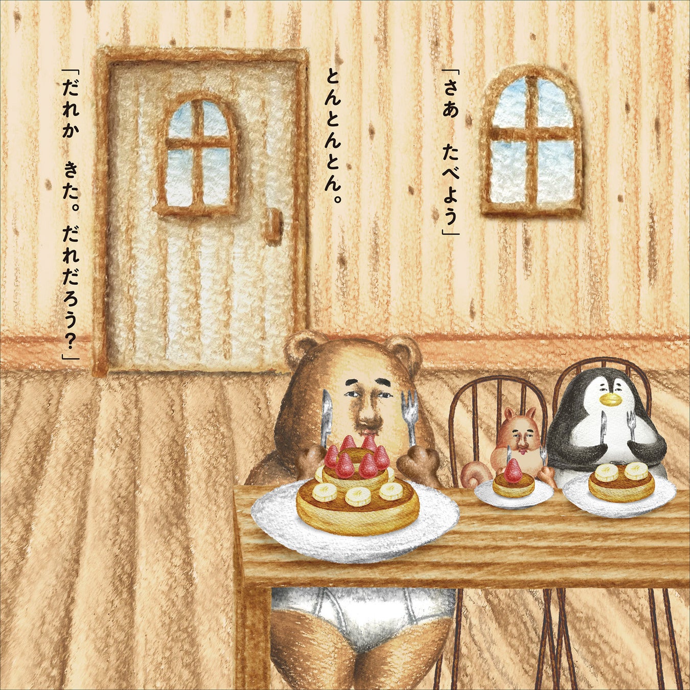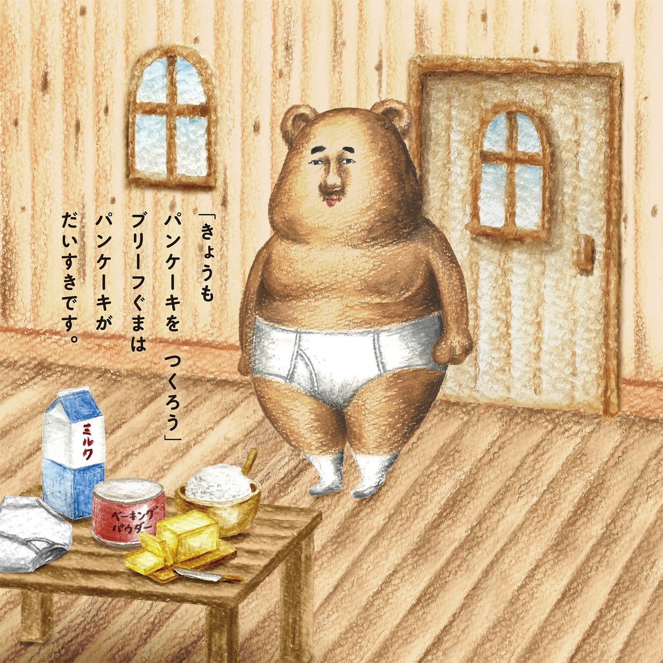 森に住むブリーフをはいたくま、ブリーフぐまが大好きなパンケーキを焼くところから物語は始まります。