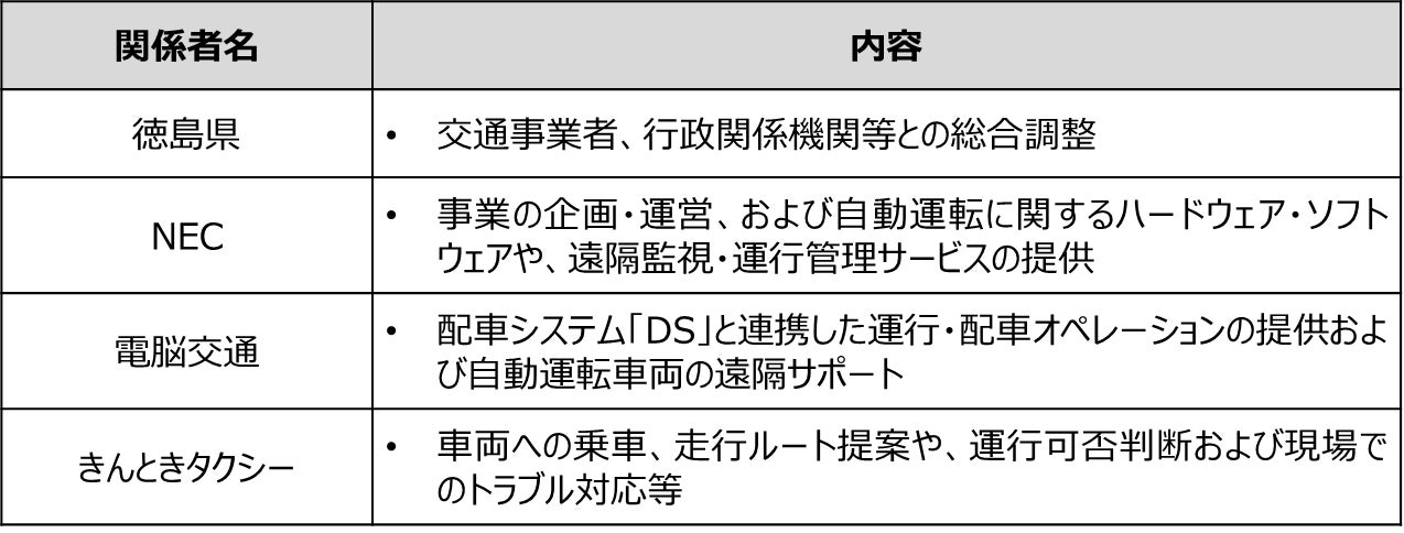 徳島県(知事:後藤田 正純)、日本電気株式会社(本社:東京都港区、取締役 代表執行役社長 兼 CEO:森田隆之、以下「NEC」)、株式会社電脳交通(本社:徳島県徳島市、代表取締役社長:近藤 洋祐、以下「電脳交通」)、株式会社旅サポート(本社: 徳島県鳴門市、代表取締役:山室 真一、以下「きんときタクシー」)は徳島県鳴門市西部を中心とするエリアで自動運転タクシーの実証運行を本日から 2026年3月31日(火)まで実施します。