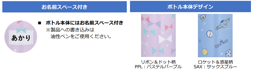 カラーは、リボンとドットが可愛らしいパステルパープルと、ロケットや惑星など宇宙をイメージしたサックスブルーの2種をご用意。ボトル本体にお名前が書けるスペースをデザインしており、新入園・新入学の時期に揃えたいアイテムです。