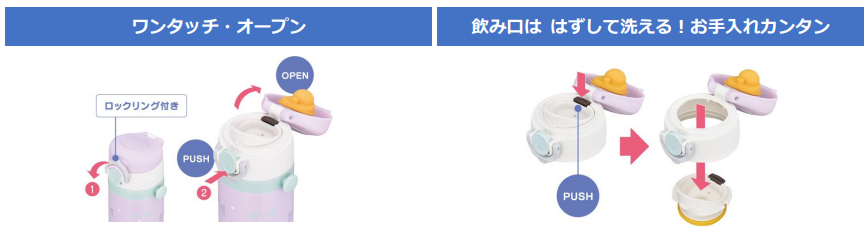 ステンレス製魔法びん構造で、高い保温・保冷力によって飲み頃の温度をキープします。ロックリング付きでワンタッチ・オープンでそのまま飲むことができ、飲み口は外して洗えるのでお手入れが簡単です。