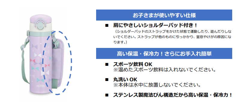 『サーモス 真空断熱キッズケータイマグ』は、持ち運びに便利なショルダーストラップ付きでお子さまも使いやすいケータイマグです。ショルダーストラップには、滑りにくいショルダーパッドが付いており、肩に優しくズレにくくなっています。ストラップの長さは、2つのアジャスターで調整可能。ストラップは取り外せるので、ボトル本体を洗う時も邪魔になりません。