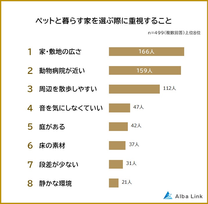 株式会社AlbaLink(本社:東京都江東区、代表取締役:河田 憲二)は、ペット(犬・猫・小動物)を飼っている499人を対象に「ペットと暮らす家に関する意識調査」を実施し、そのデータをランキングにしました。