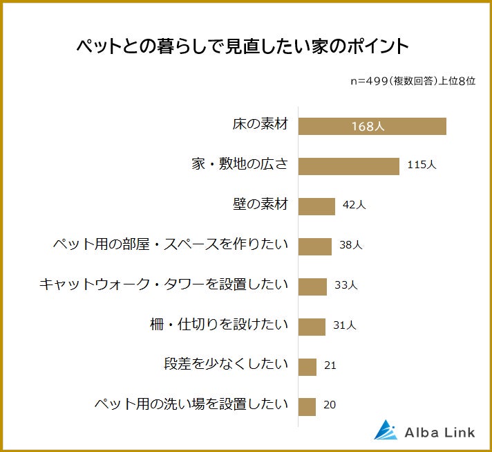 ペットとの暮らしで見直したい家のポイント1位は「床の素材(168人)」でした。2位「家・敷地の広さ(115人)」、3位「壁の素材(42人)」が続きます。「重視するポイント」と重複する項目も多くランクインしています。