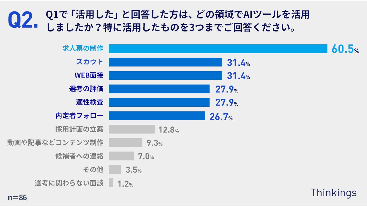 Q1で「活用した」と回答した人にどの領域でAIツールを活用したか尋ねたところ、「求人票の制作」が60.5%で最も多く、次いで「スカウト」、「WEB面接」がともに31.4%でした。