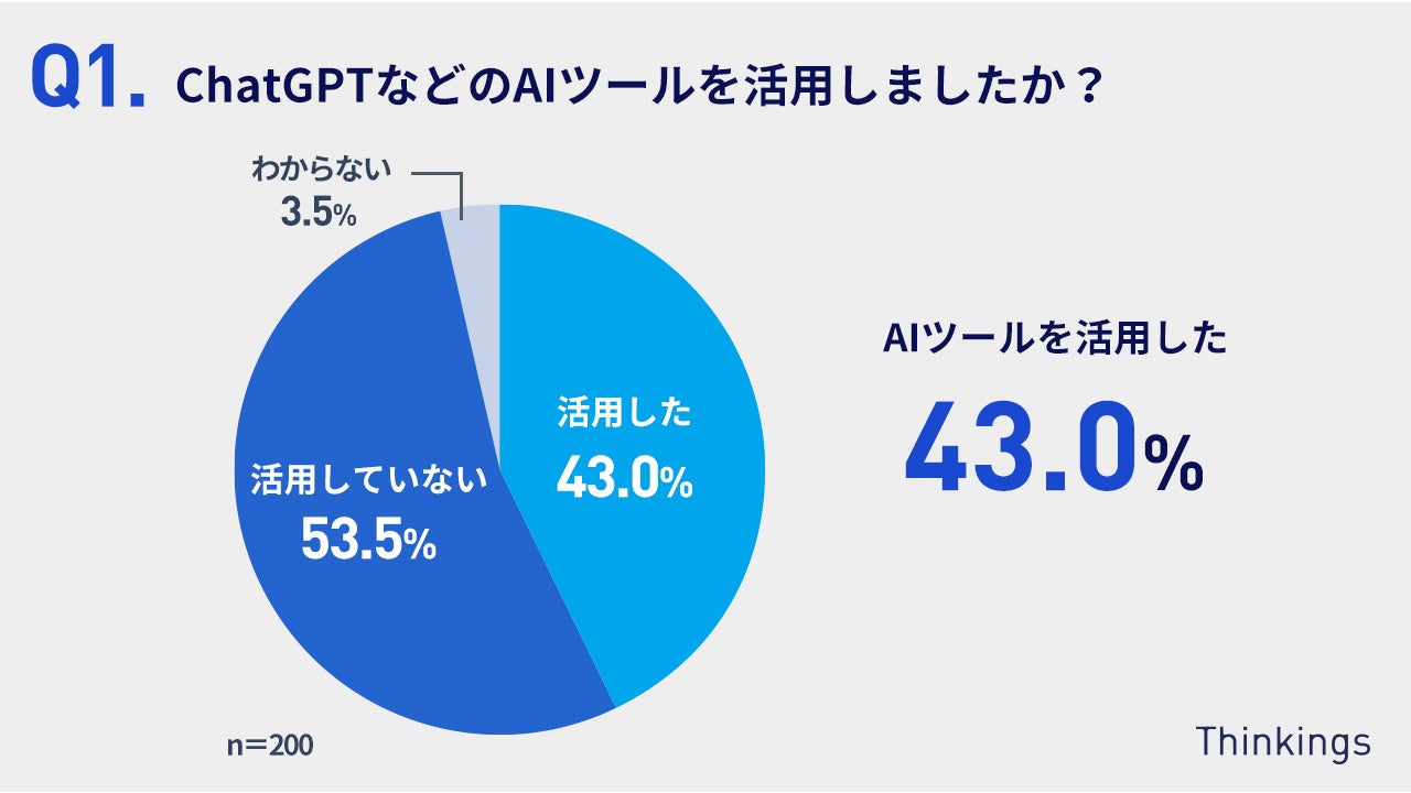 2023年度の採用活動におけるChatGPTなどのAIツールの活用状況について尋ねたところ、「活用した」と回答したのは43.0%、「活用していない」と回答したのは53.5%でした。
