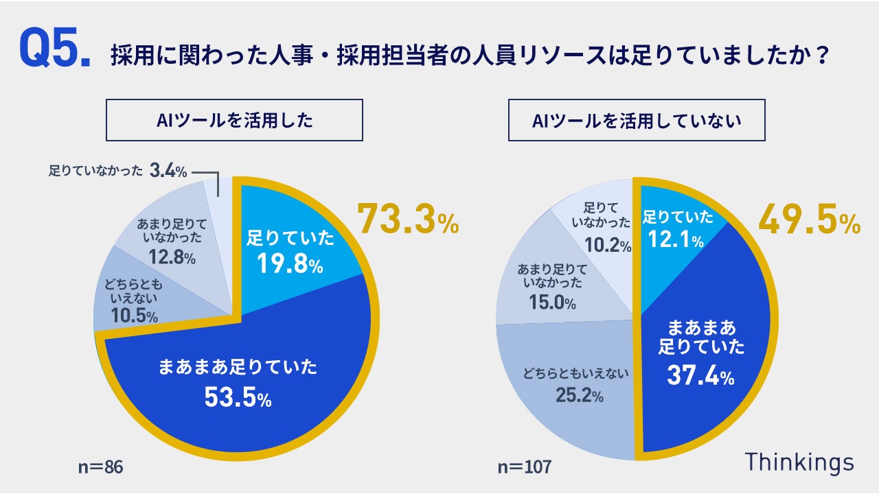 調査結果によると、AIツールを活用している企業は、目標採用数や採用の質に対する満足度が高く、人事のリソースについても比較的充足している傾向があります。