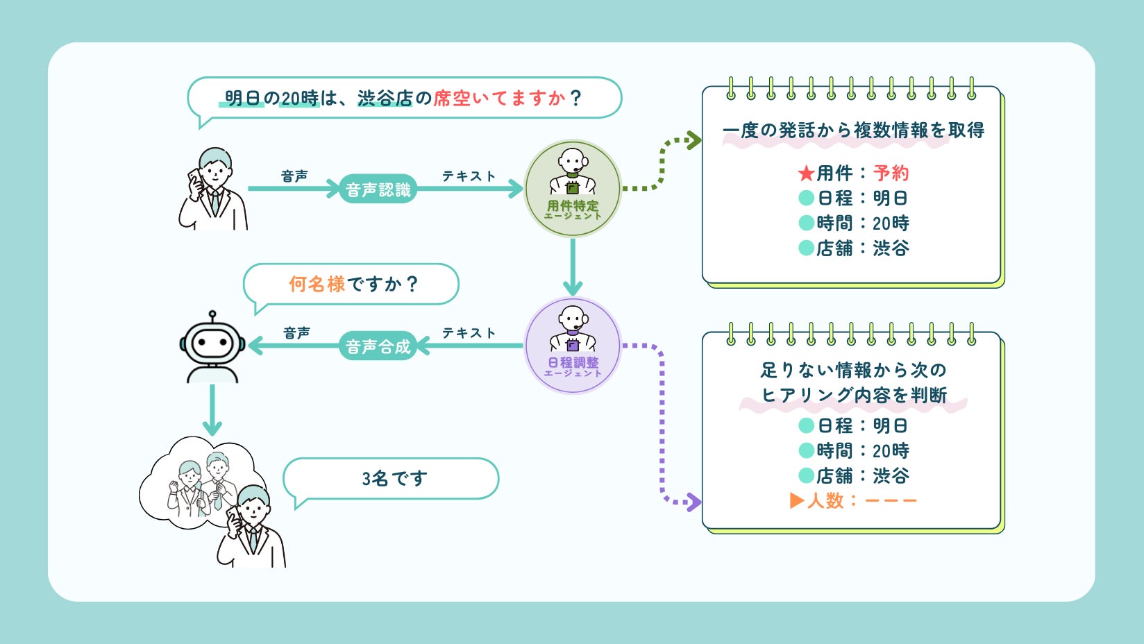 日程調整エージェントでは、お客様の一度の発話から必要な情報を取得し、足りない項目のみのヒアリングを行うことでユーザー主導の対話を実現いたします。