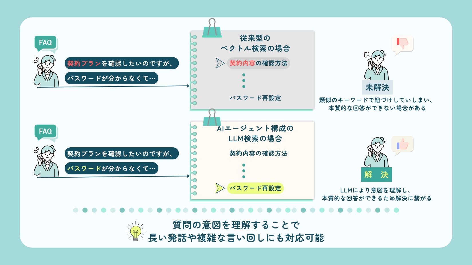 FAQ回答エージェントでは、生成AIを意図理解の精度向上のみに限定して使用しております。