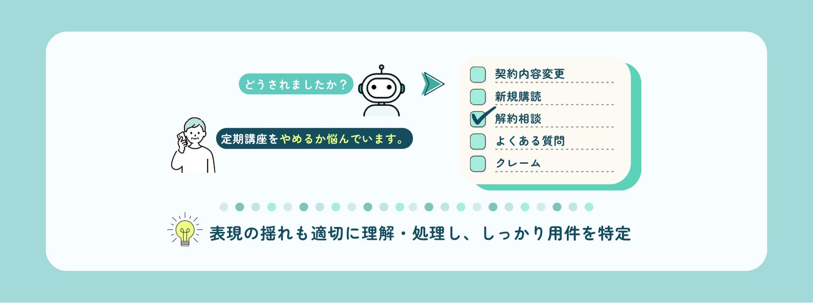 トレーニングフレーズを登録することで表現の揺れ(例:やめる→解約)なども適切に理解・処理し、しっかりと用件特定を行います。