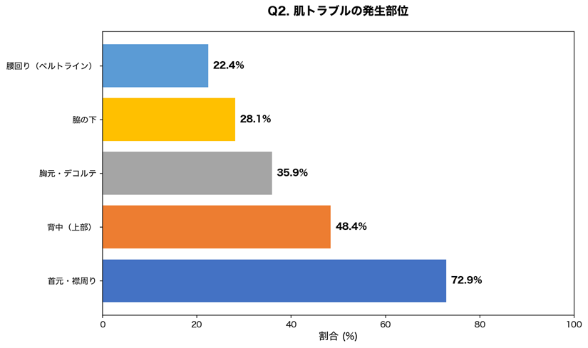 最も肌トラブルが発生しやすいのは首元・襟周りで、ワイシャツの襟やネクタイとの摩擦が主な原因と考えられます。背中や胸元も高い割合を示しており、衣類が密着する部位全般でトラブルが起きやすいことが分かります。