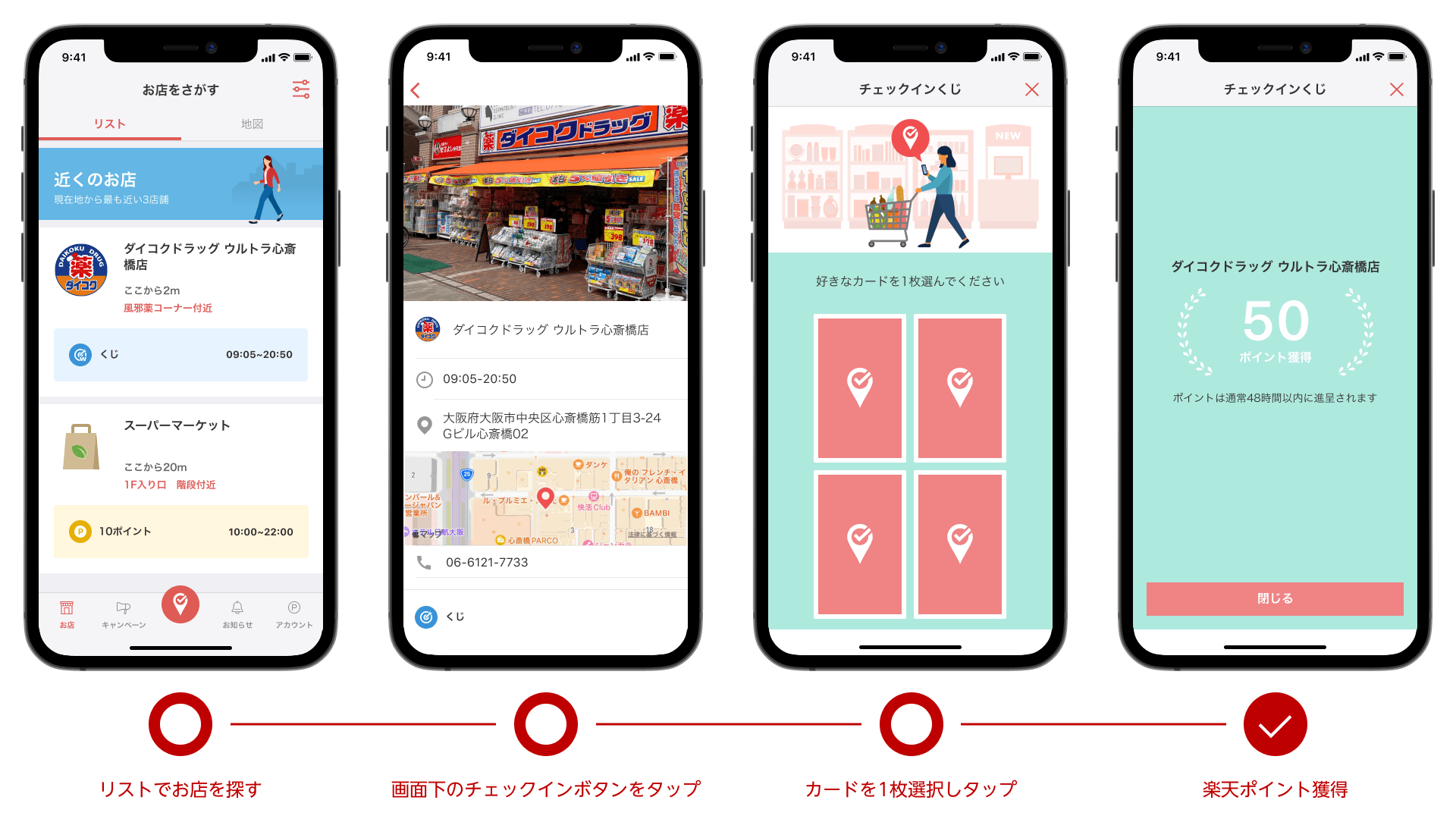・概要: 対象となる「ダイコクドラッグ」への来店時に、店内の指定エリアで「楽天チェック」アプリを起動し、チェックインボタンをタップすると、1回のチェックインにつき1回くじを引くことができます。くじ引きで獲得できるポイントは、1ポイント・3ポイント・5ポイント・10ポイント・50ポイントのいずれかの通常ポイントです。