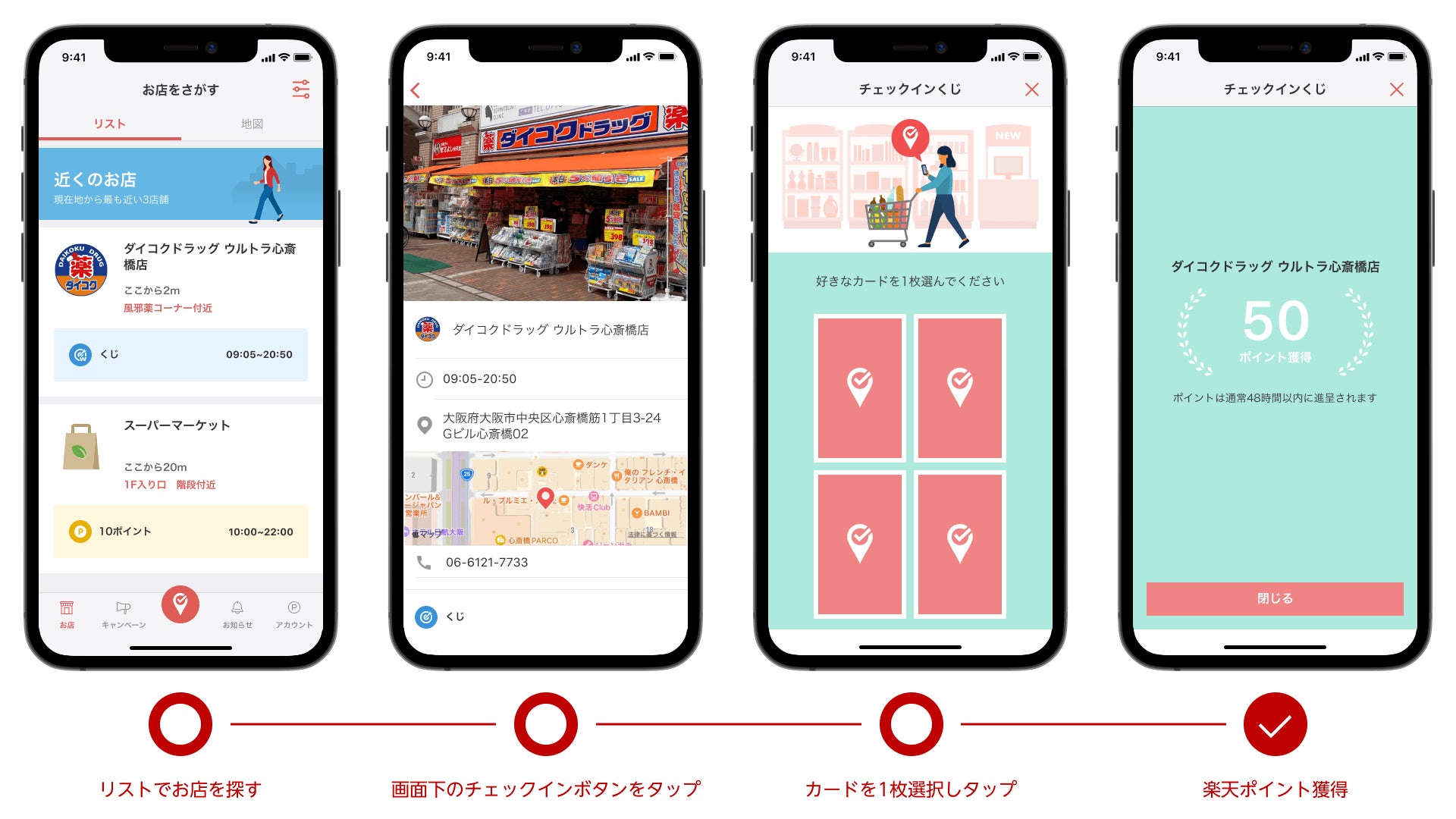 利用者は対象店舗に来店し、店内の指定エリアで「楽天チェック」アプリを起動しチェックインすると、くじ形式で「楽天ポイント」を最大50ポイント獲得することができるようになります。ダイコクは、共通ポイントサービス「楽天ポイントカード」、スマホ決済サービス「楽天ペイ(アプリ決済)」、電子マネー「楽天Edy」を導入済みのため、このたび利用可能となる「楽天チェック」を併せると、「楽天ポイント」の最大四重取りが可能となります(注)。