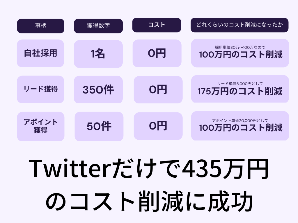 株式会社ソルフェリオーナ(東京都港区芝大門1-3-6 3F、代表:菊地将、URL:https://www.solferiona.com/)が自社で運用するTwitterが435万円のコストカットに成功いたしました。