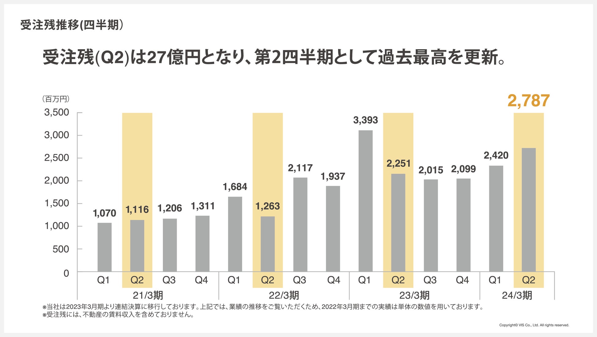 第2四半期の受注残は27億円となり、第2四半期として過去最高を更新しました。