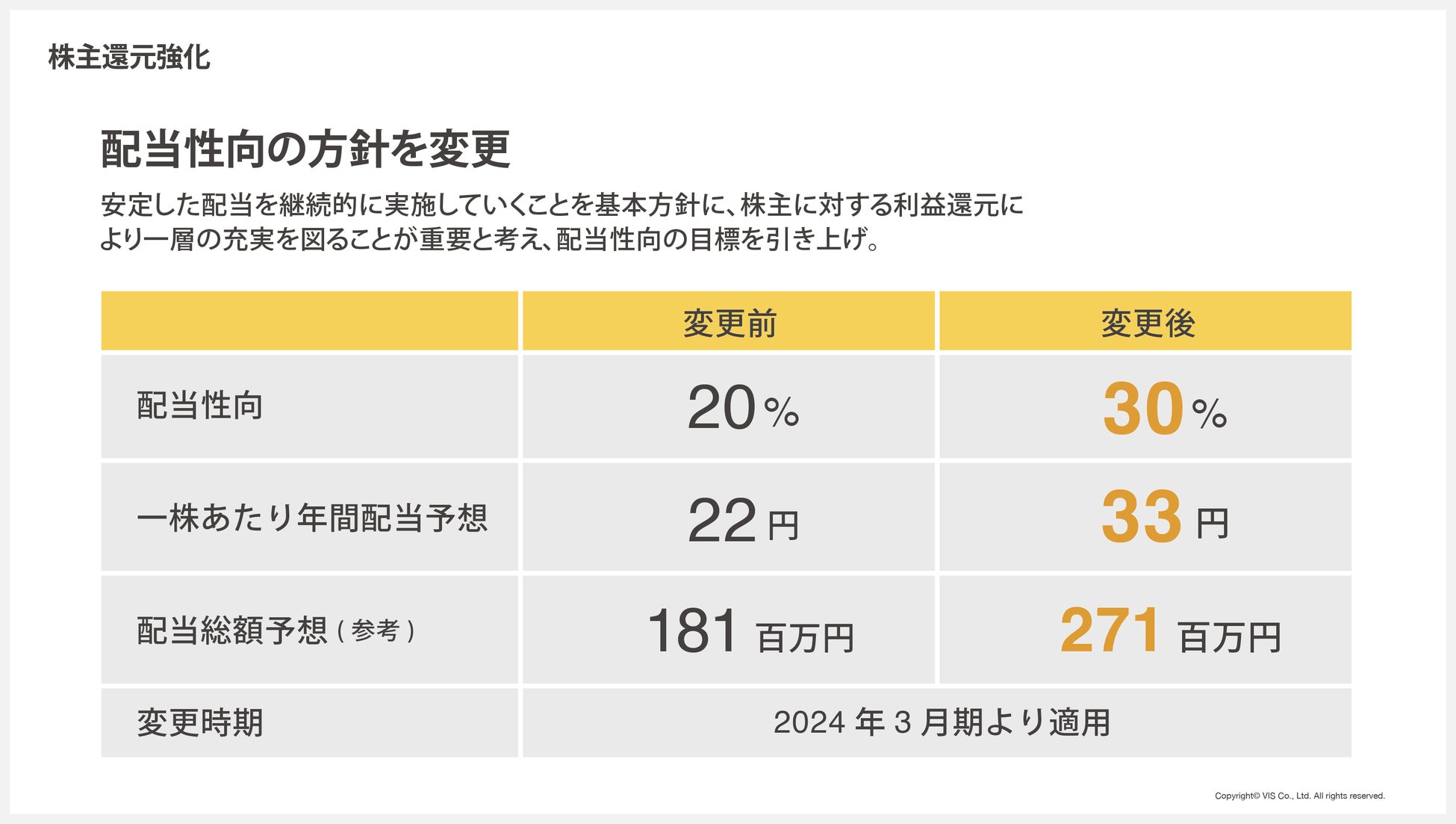 <ヴィス>売上高、営業利益ともに予想を上回って着地。株主還元強化のため配当性向の引き上げを発表。(2024年3月期第2四半期決算を発表)
