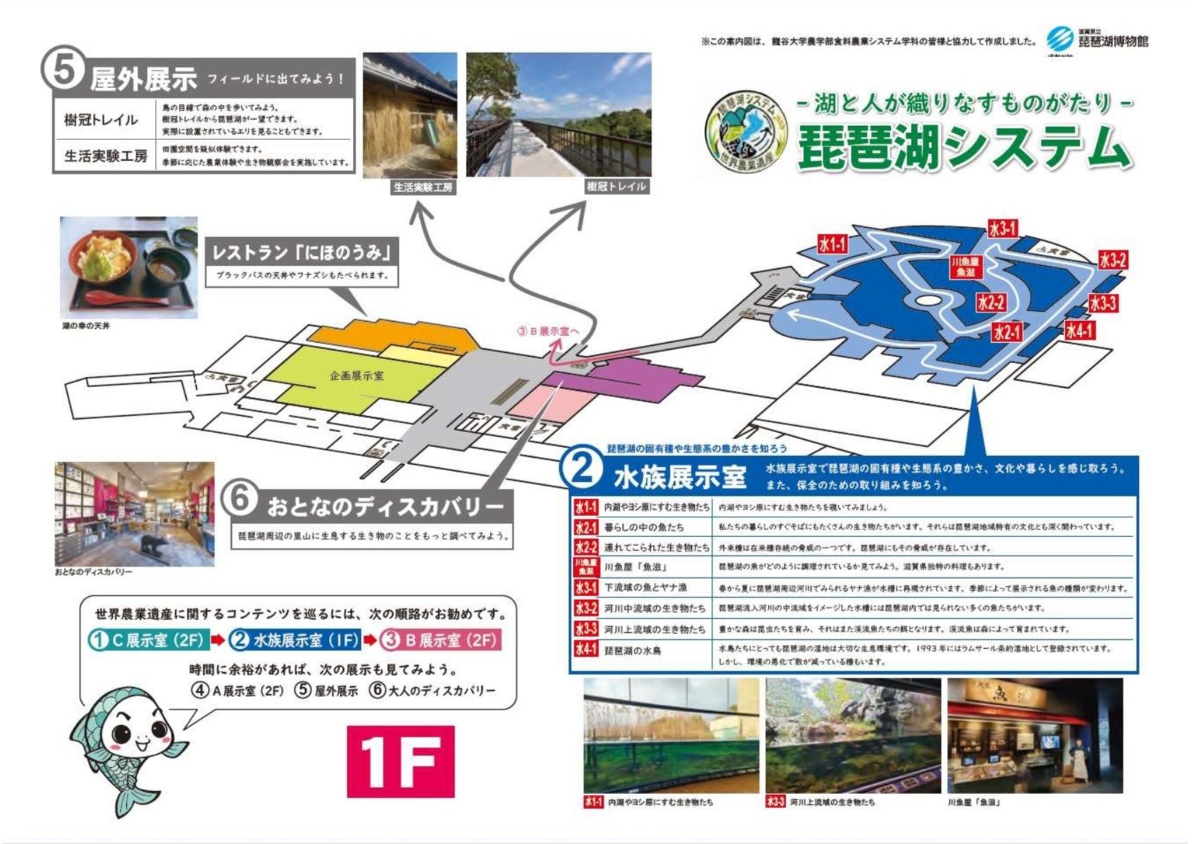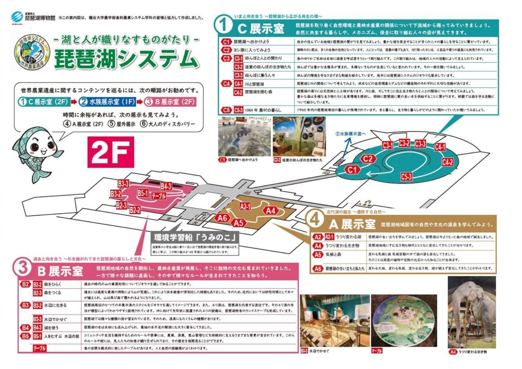 このルートマップは、2023年10月から開始した琵琶湖博物館と龍谷大学農学部との地域連携事業として、食料農業システム学科の嶋田大作准教授の協力のもと作成しました。県農政水産部農政課企画・世界農業遺産係の協力のもと、嶋田ゼミの学生たちが「琵琶湖システム」について学び、博物館におもむき展示室を丹念に調べながら、ルートマップで取り上げる展示やコースを練ってもらいました。