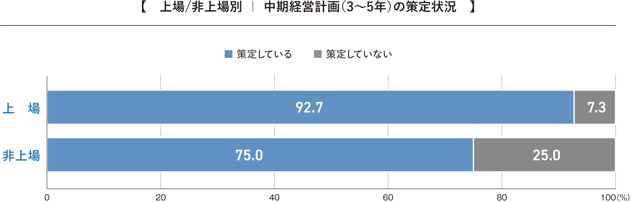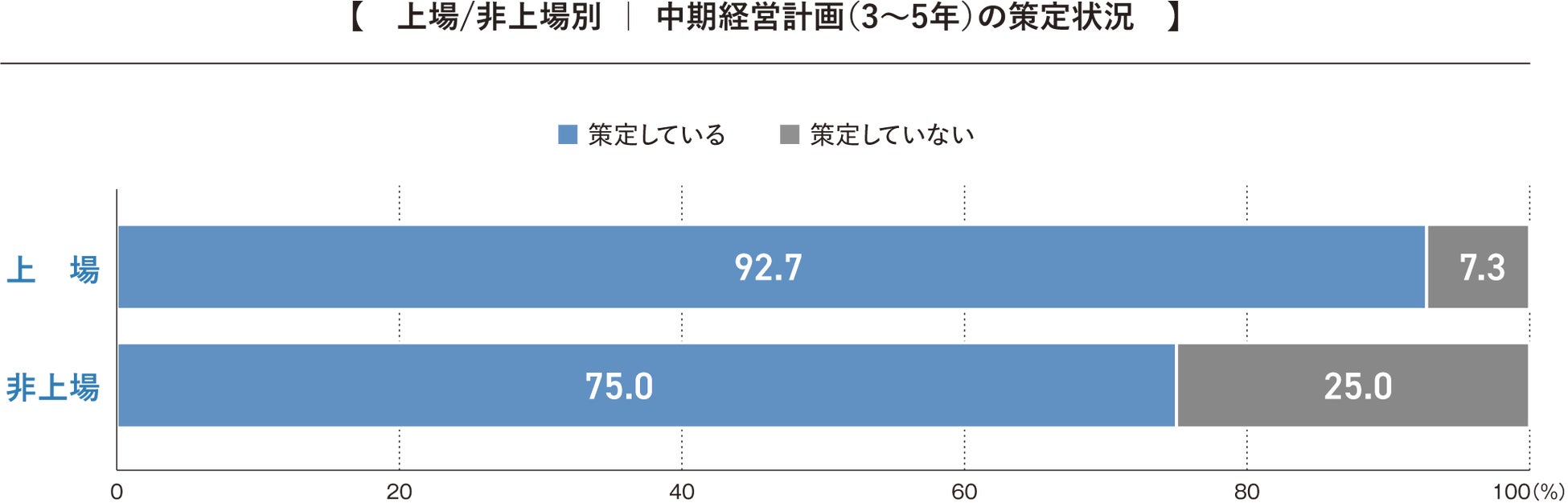 上場・非上場別に中期経営計画(3~5年)の策定状況のグラフを見ると、上場企業は92.7%が中期経営計画を策定していることが分かりました。また、非上場企業では75.0%が策定していると回答。4社に1社が策定できていない状況にあり、結果に開きが見られました。