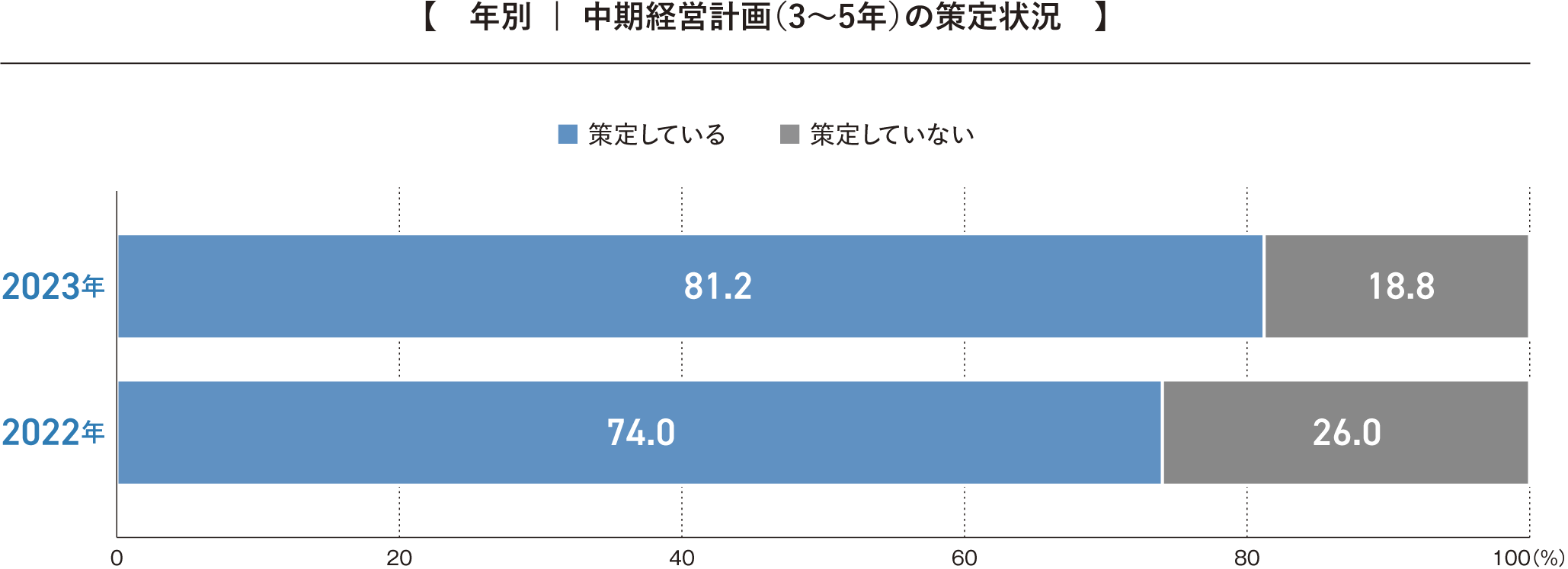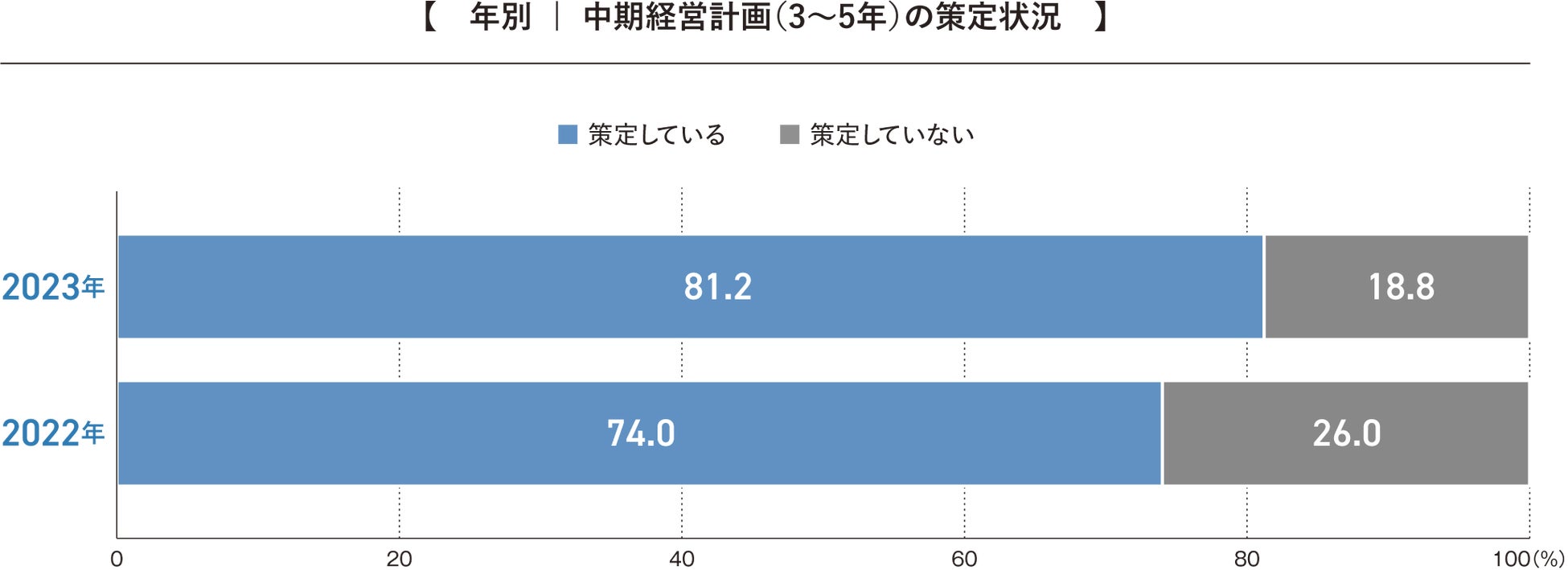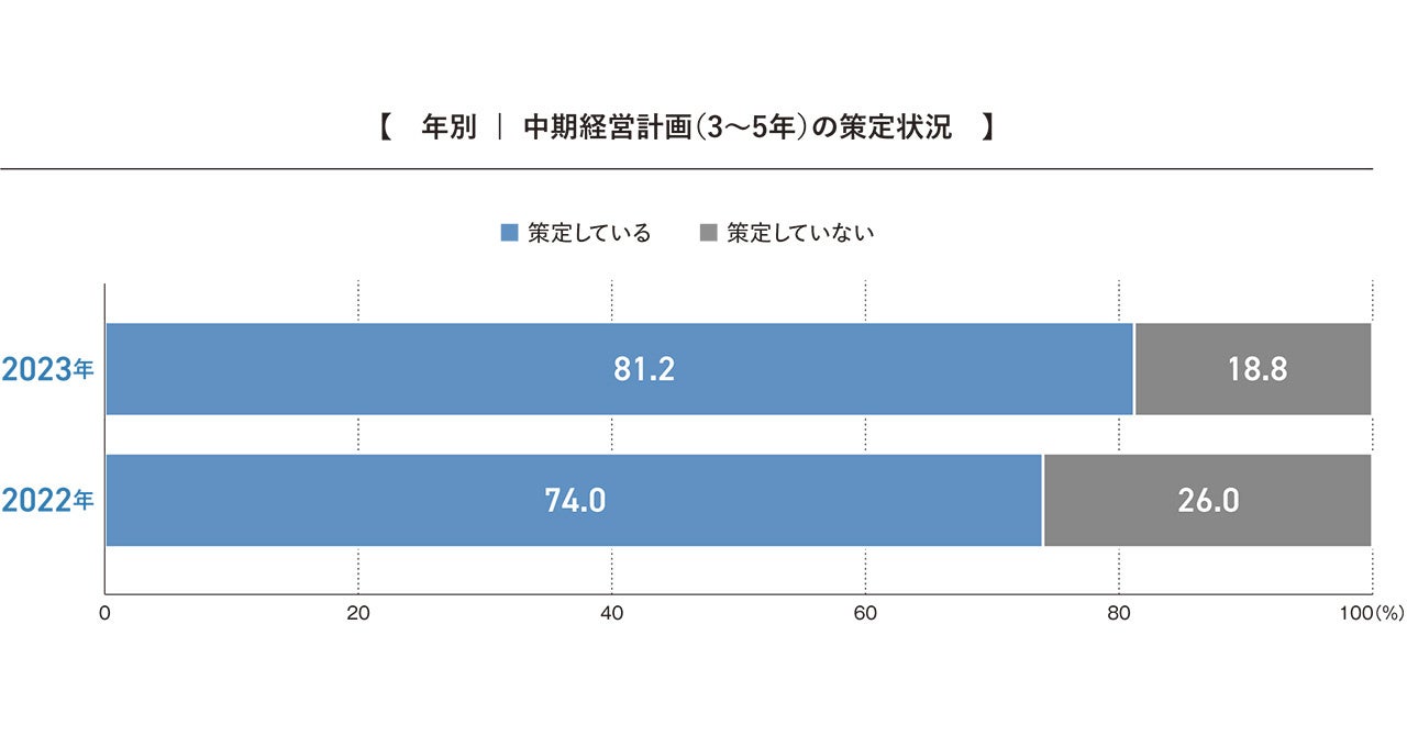 中期経営計画(3~5年)を「策定している」企業は8割以上に。昨年対比で約7ポイント増加となりました。