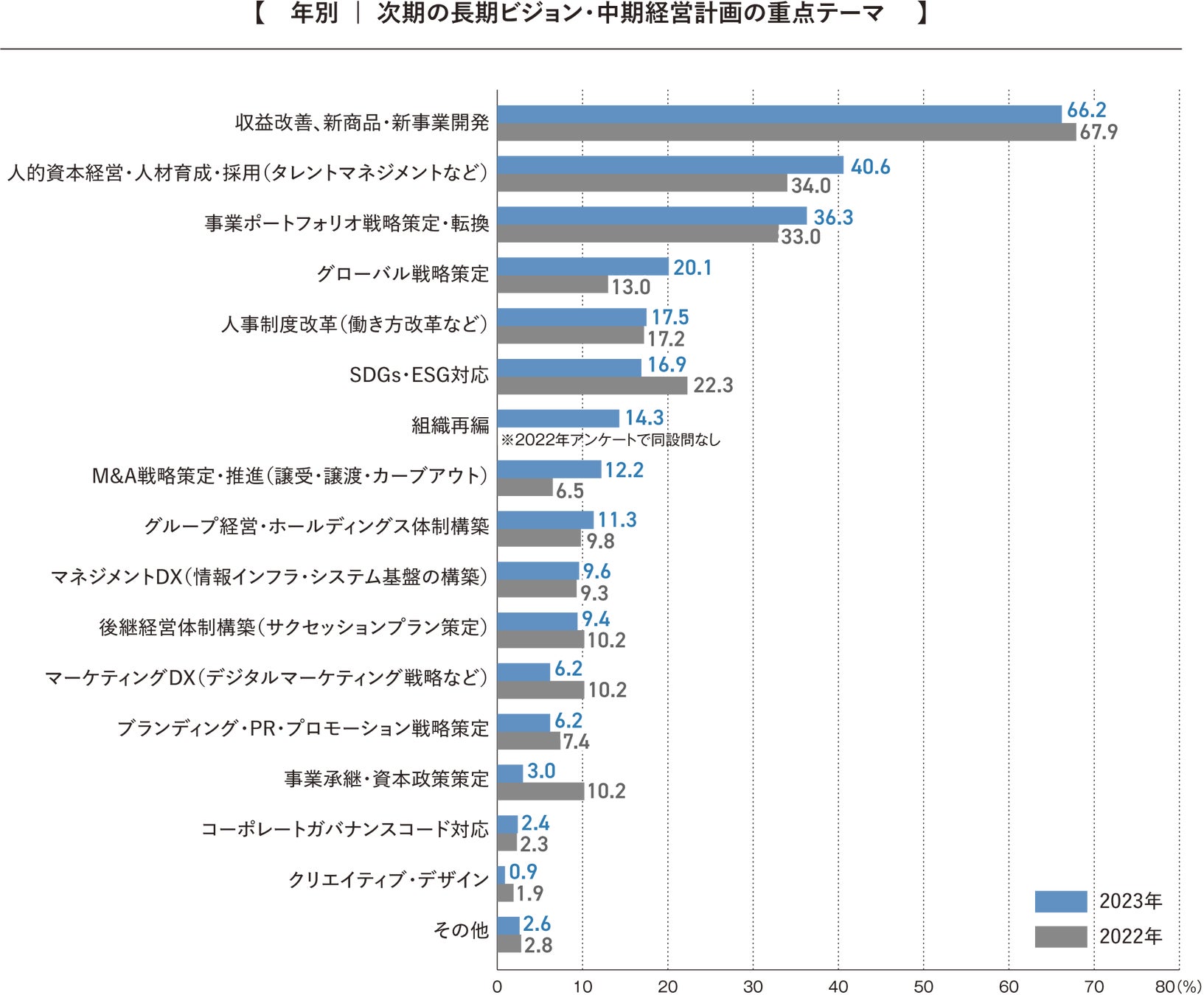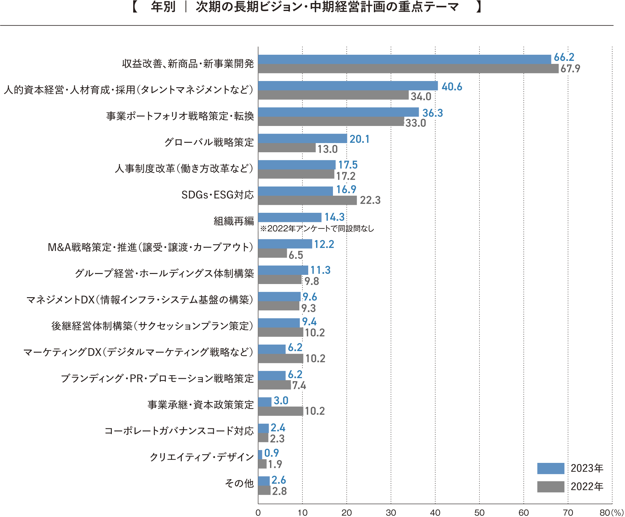 次期の長期ビジョン・中期経営計画における重点テーマについて尋ねると、「収益改善、新商品・新事業開発」(66.2%)が最多となりました。次いで「人的資本経営・人材育成・採用(タレントマネジメントなど)」(40.6%)となり、昨年と比較し増加しています。