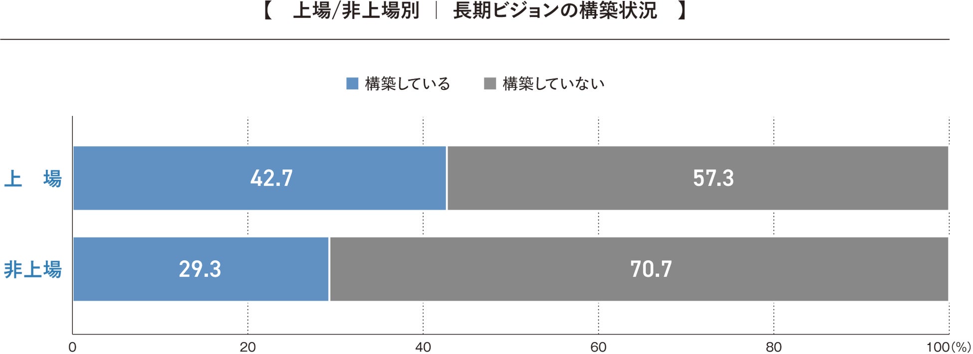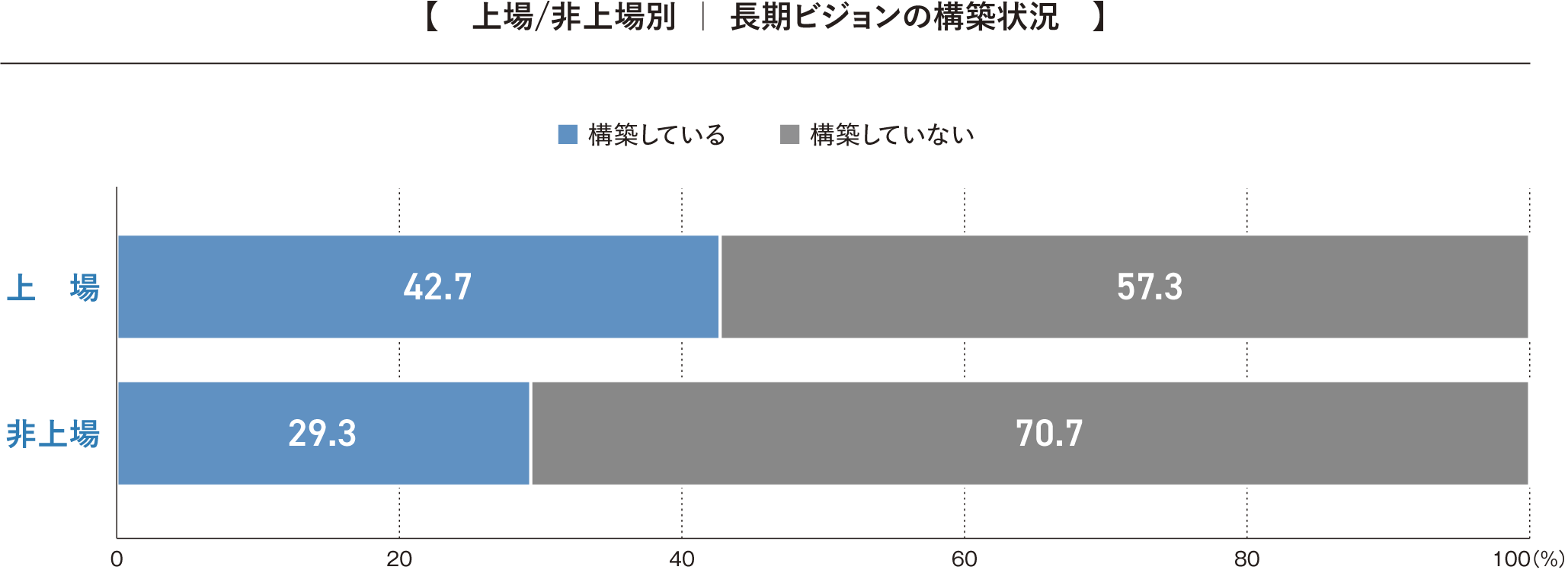 長期ビジョンの構築状況は約7割の企業が「構築していない」と回答。上場・非上場別の長期ビジョンの構築状況は上場企業の約6割、非上場企業の7割以上が「構築していない」という結果となりました。