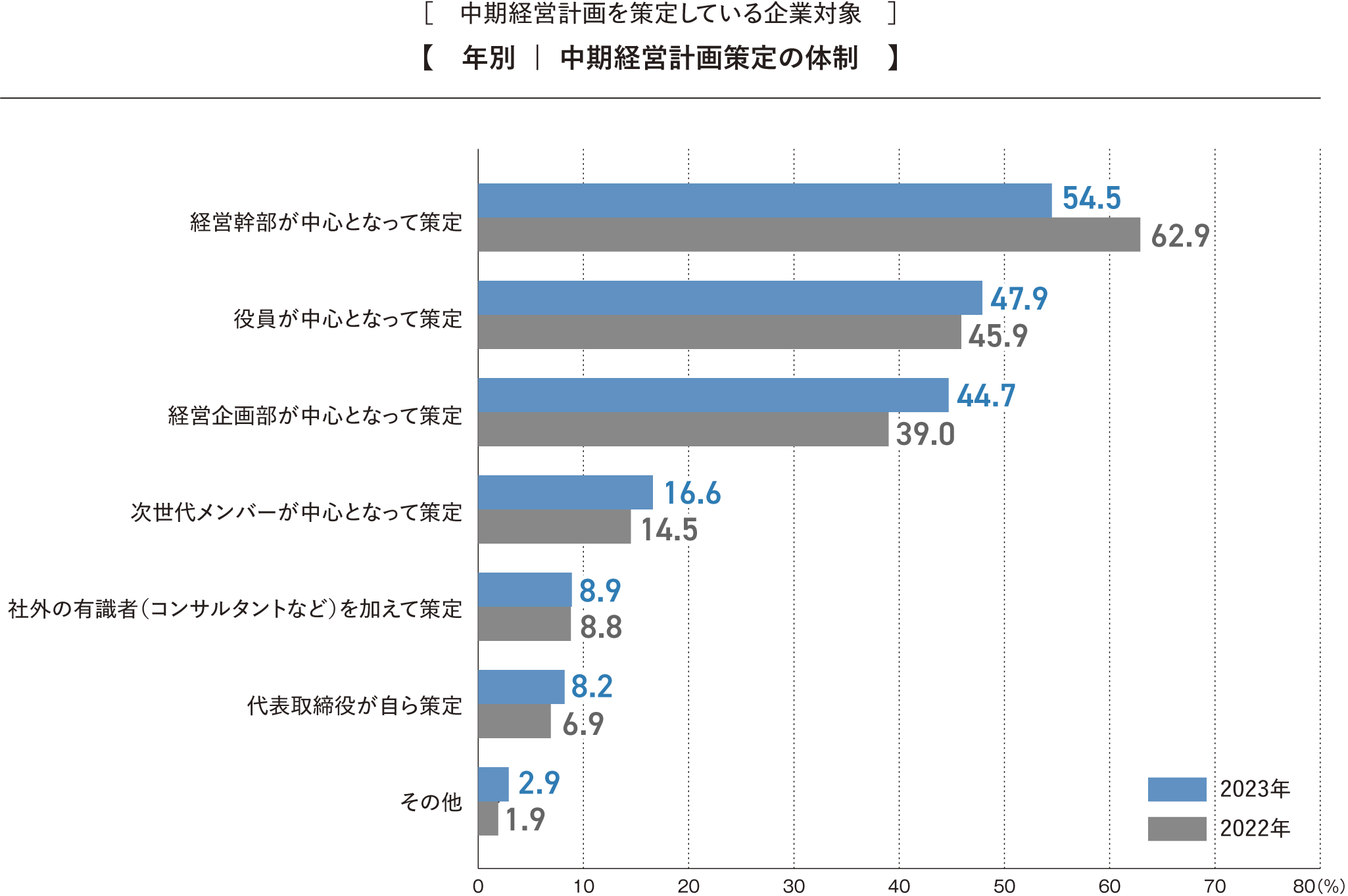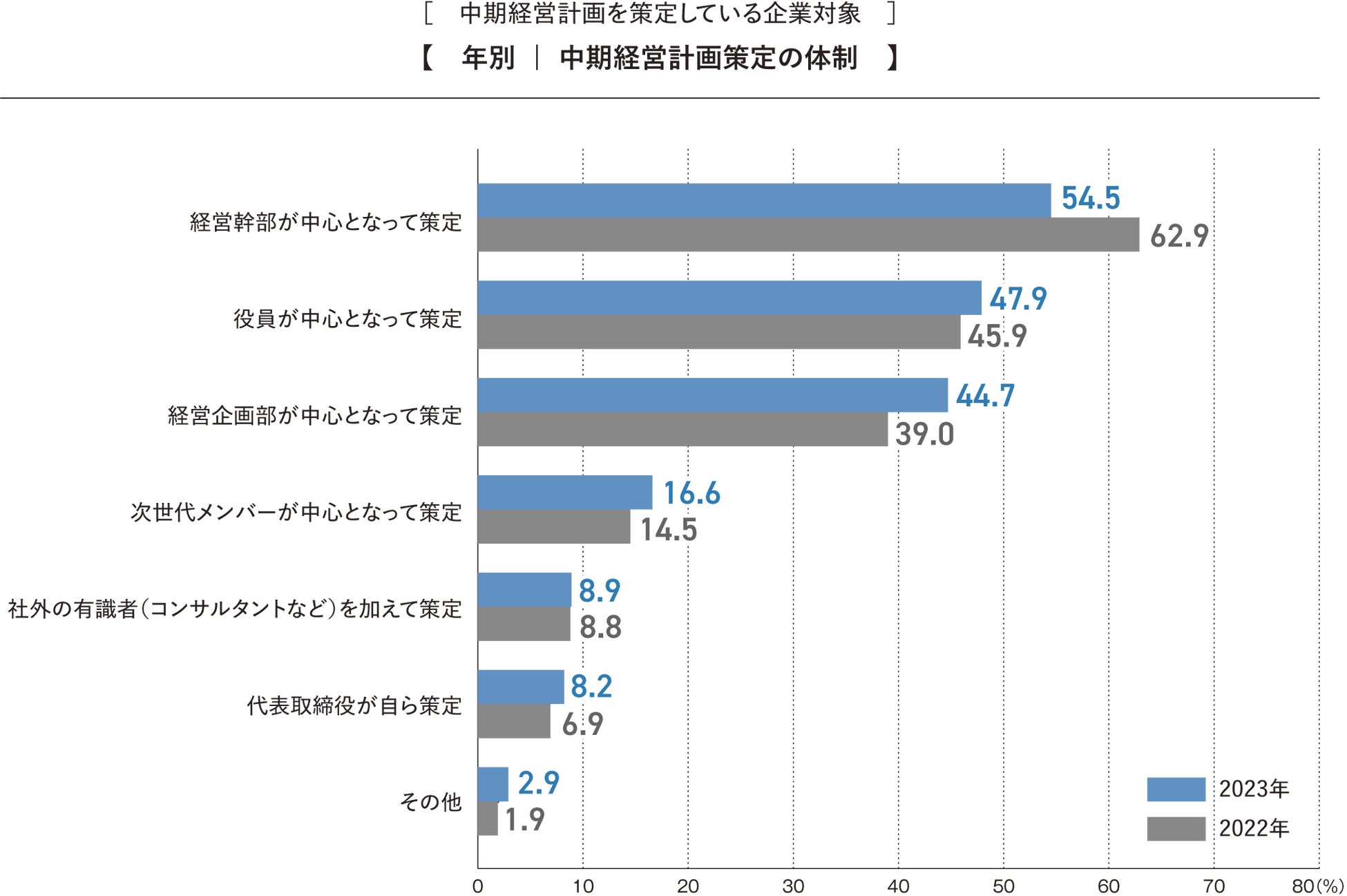 「中期経営計画を策定している」と回答した企業を対象に、中期経営計画の策定体制について尋ねると、「経営幹部が中心となって策定」(54.5%)と最多に。次いで「役員が中心となって策定」(47.9%)、「経営企画部が中心となって策定」(44.7%)となりました。昨年と比較しても、中期経営計画を策定する体制がより幅広くなっていることが分かります。