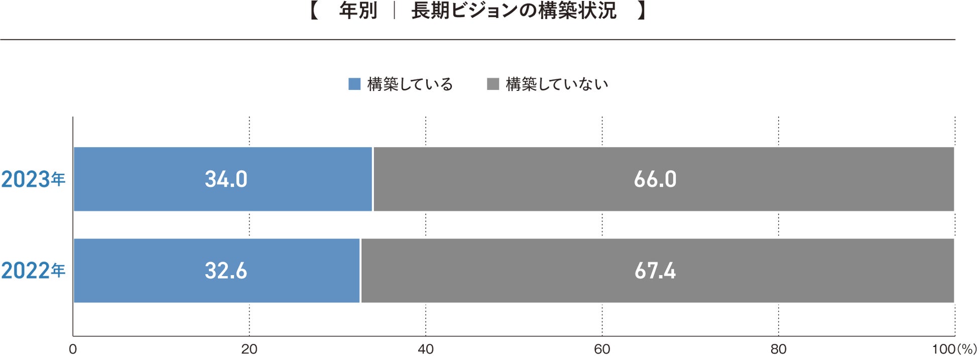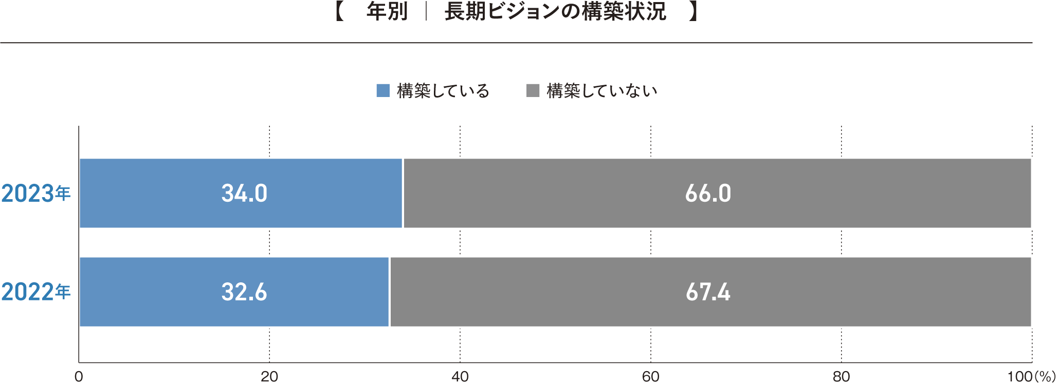 長期ビジョンの構築状況について尋ねると、66.0%の企業が「構築していない」という回答となりました。昨年の同アンケート結果と比較すると、長期ビジョンを構築している企業は1.4ポイント増えていることが分かります。