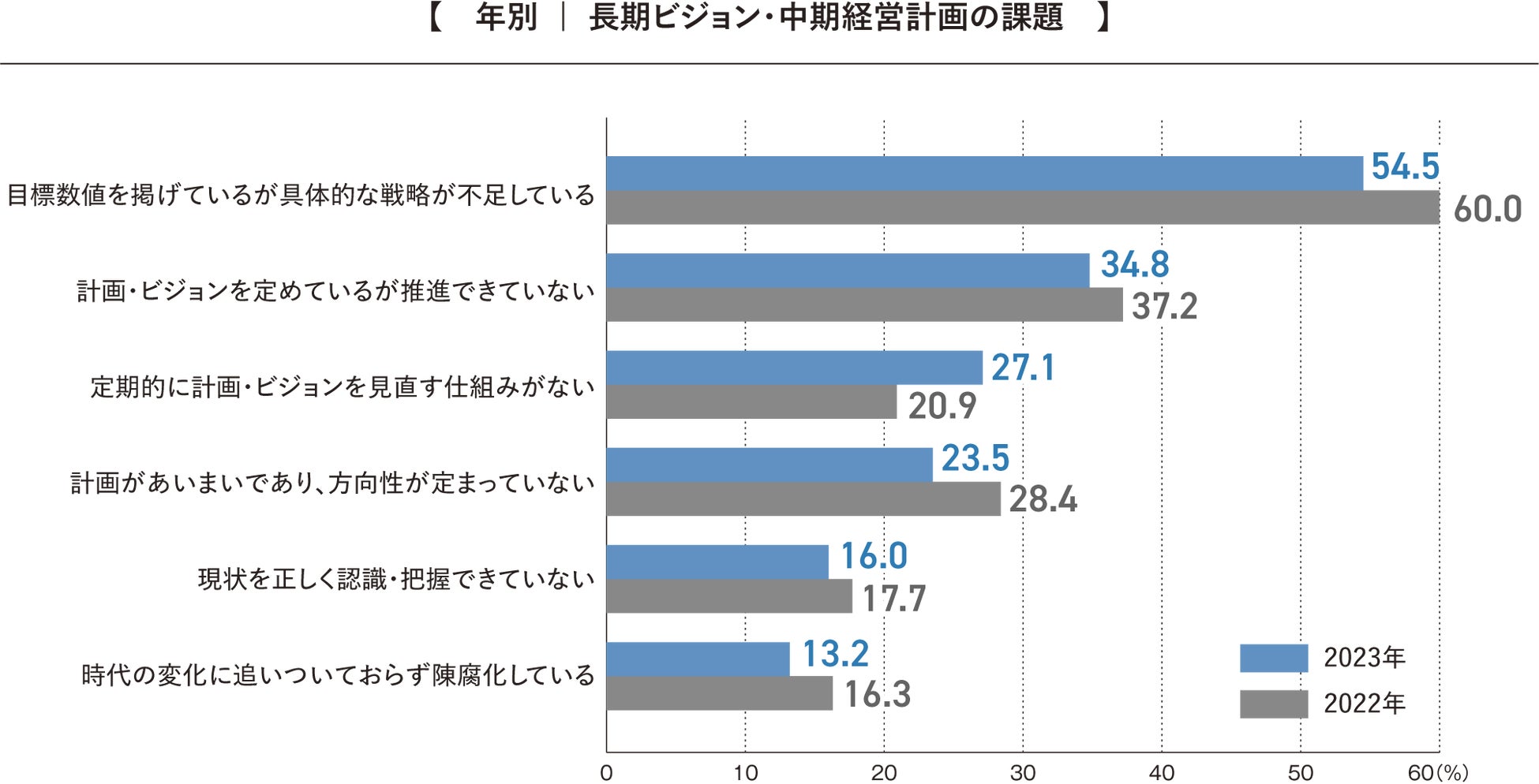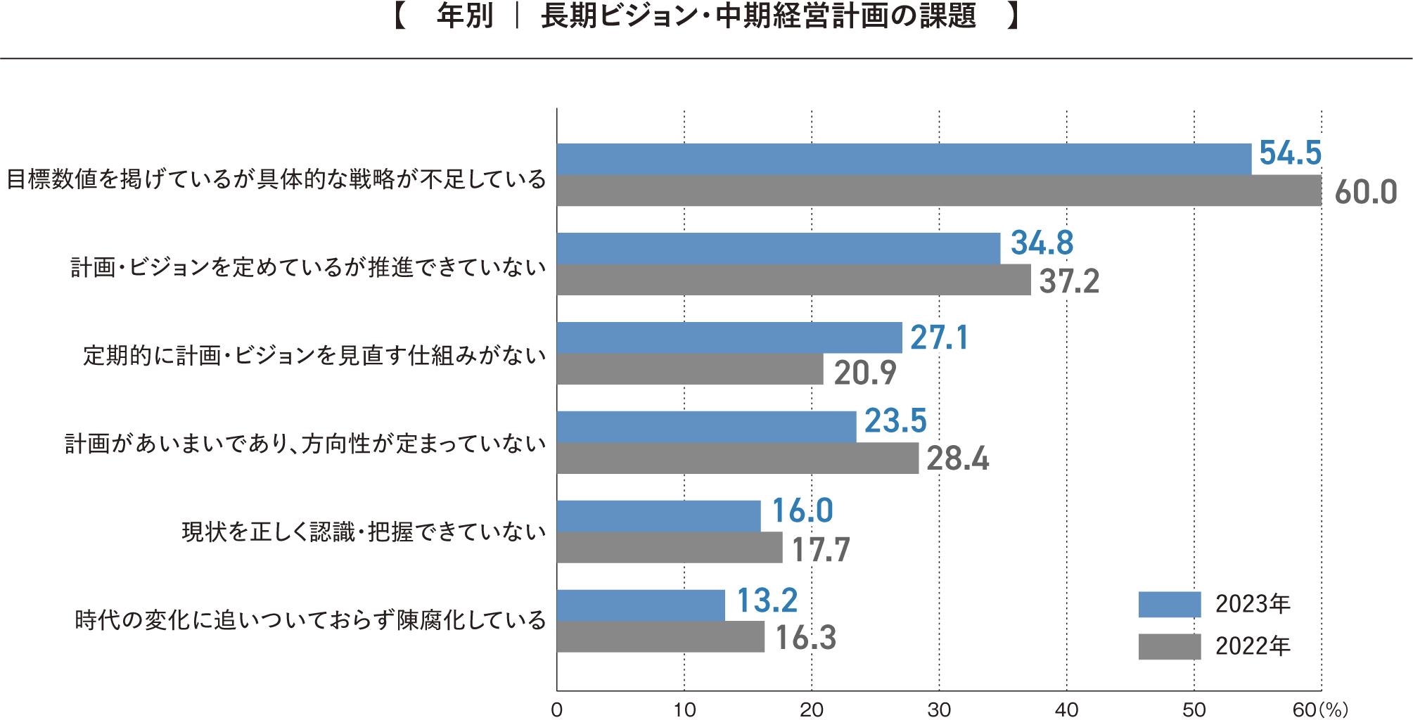 現在の長期ビジョン・中期経営計画の課題について尋ねると、「目標数値を掲げているが具体的な戦略が不足している」(54.5%)、次いで「計画・ビジョンを定めているが推進できていない」(34.8%)となり、打ち手に関する課題が上位に挙げられました。また、「定期的に計画・ビジョンを見直す仕組みがない」(27.1%)という回答は、昨年と比較し6.2ポイント増加しています。