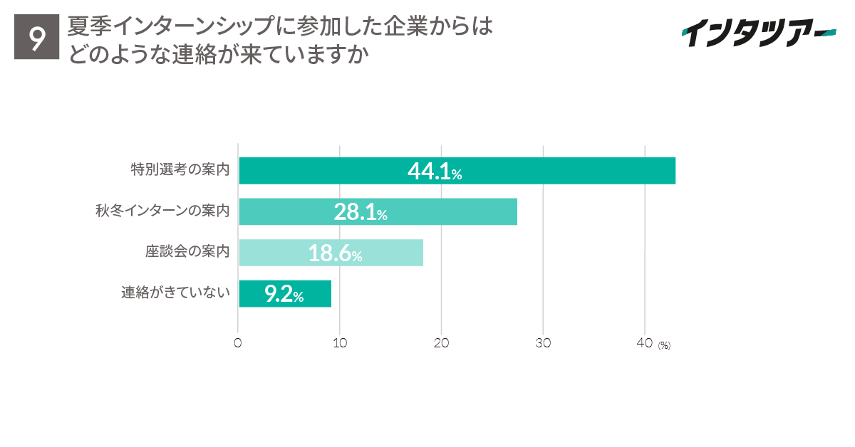 設問9では夏季インターンシップに参加後、企業から来た連絡についてどういったものが来ているか聞きました。