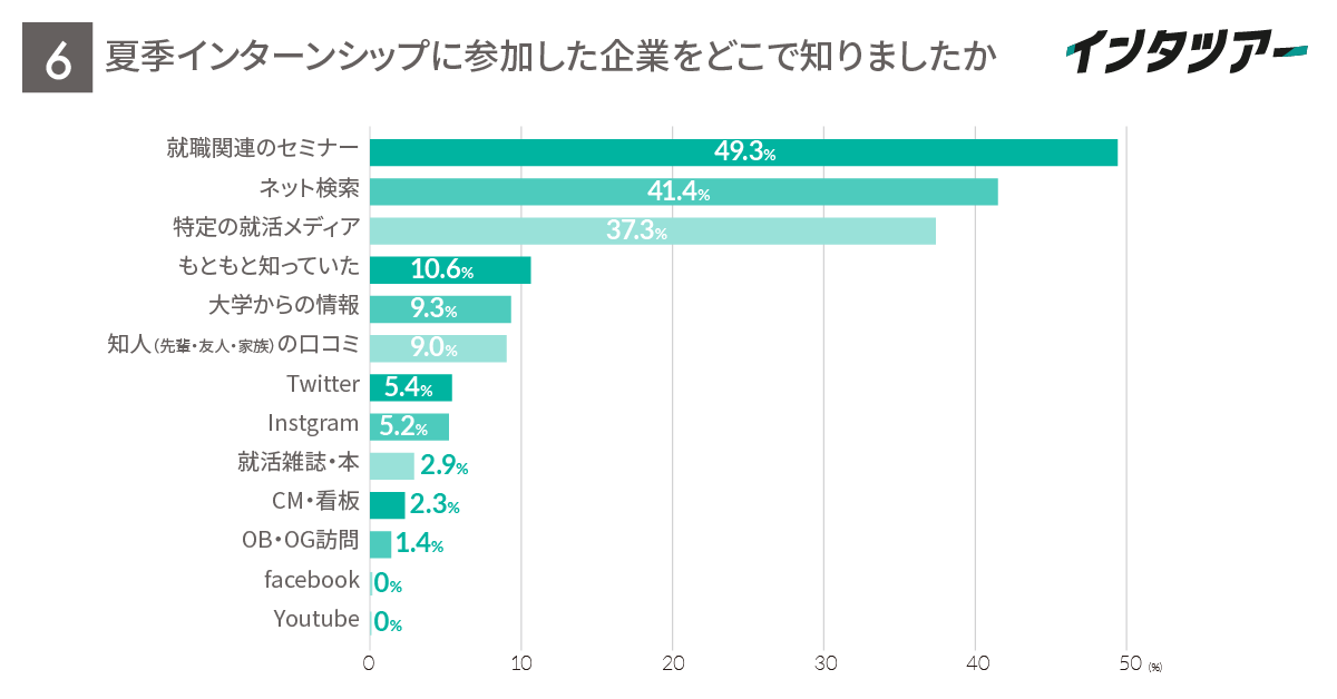 設問6では夏季インターンシップに参加した企業を知った経路について複数回答で聞きました。