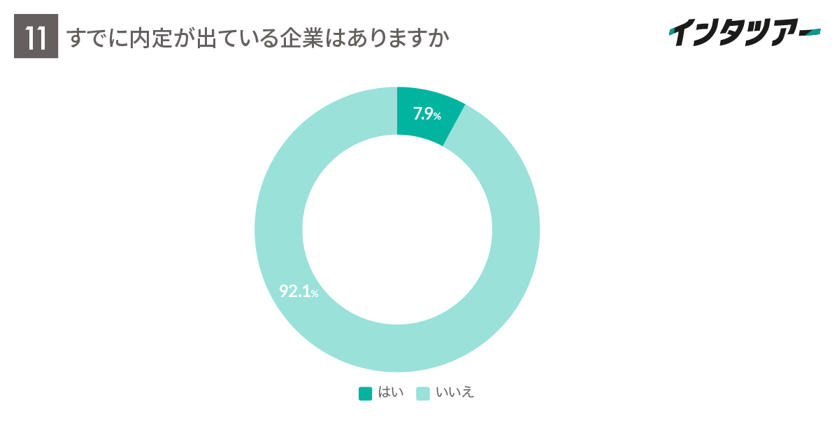 設問11では、すでに内定が出ている企業があるか聞きました。「はい」と答えた学生は7.9%でした。