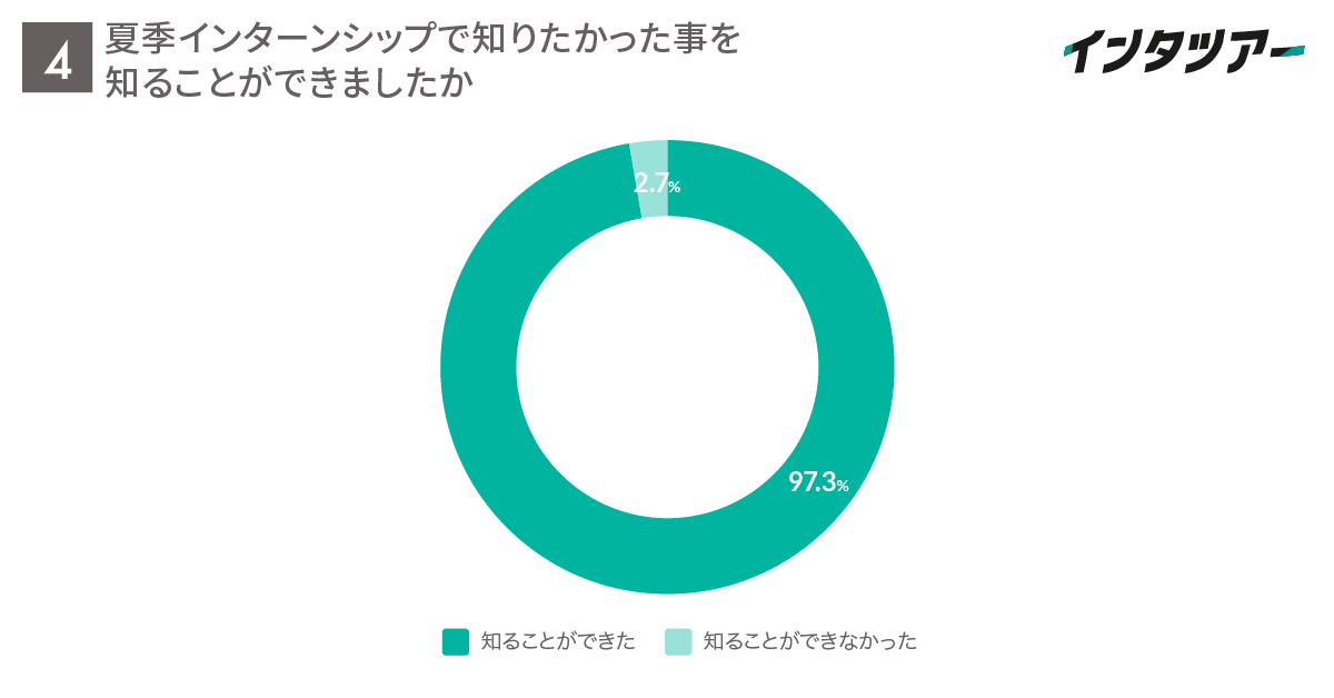 設問4ではインターンシップに参加したことで知りたかったことを知ることができたか聞きました。97.3%の学生が「知ることができた」と回答しており、インターンシップを通じた情報収集や体験は満足のいく結果を収めたといえます。