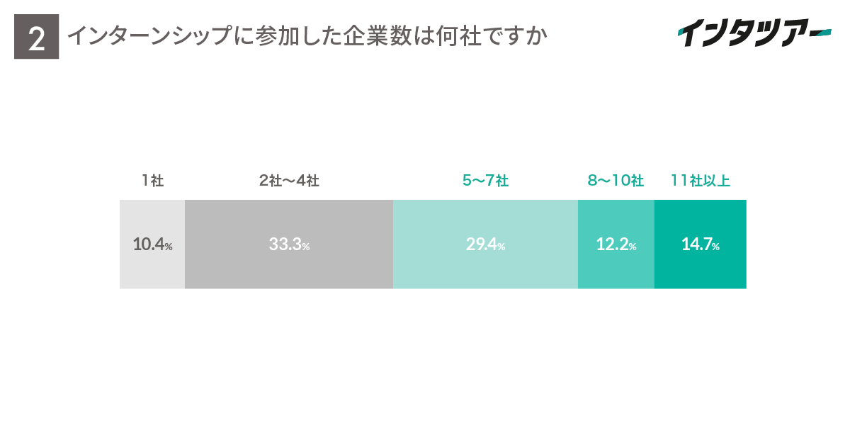 また、設問2では夏季インターンシップに参加した企業の数を聞きました。最多となったのは「2社~4社」33.3%で、「5社~7社」29.4%が続きました。複数企業のインターンシップに参加し、7社以内がボリュームゾーンとなりました。