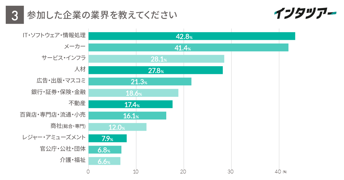最も回答が多かった業界は「IT・ソフトウェア・情報処理」42.8%で、以下「メーカー」41.4%、「サービス・インフラ」28.1%、「人材」27.8%が続きました。