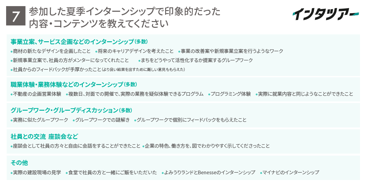 Q7. 参加した夏季インターンシップで印象的だった内容・コンテンツを教えてください