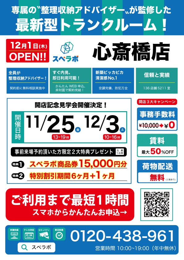 【12月1日(木)オープン】見学から契約、解約まで完全非接触・非対面、お申し込みからご利用まで最短1時間!都内、大阪などにて絶賛運営中のトランクルーム【スペラボ】が大阪市中央区に出店!