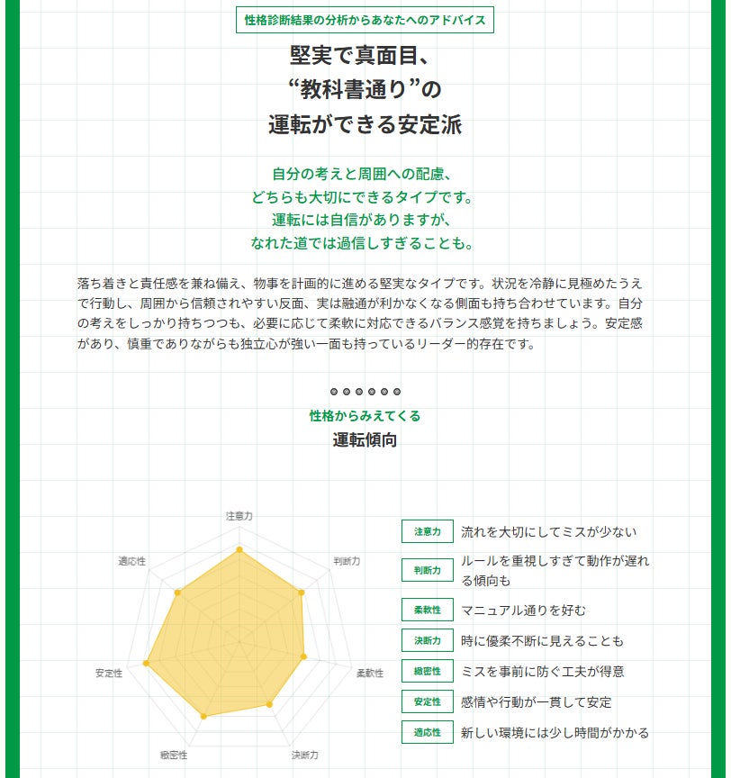 本サービスは、ディグラム・ラボ社が心療内科医や臨床心理士などの間でも用いられている心理テスト「エゴグラム」をベースに、数万人規模のアンケート調査および対面心理テスト診断(実証実験)から改良を重ね独自に開発した「ディグラム診断」を活用。簡単な20個の質問に答えるだけで、9つの基本性格タイプの中からご自身のタイプを判定。その性格に応じた運転上の強み・弱みや、交通安全のための心がけをアドバイスします(協力:株式会社電脳 URL: https://www.dennoo.co.jp/)。